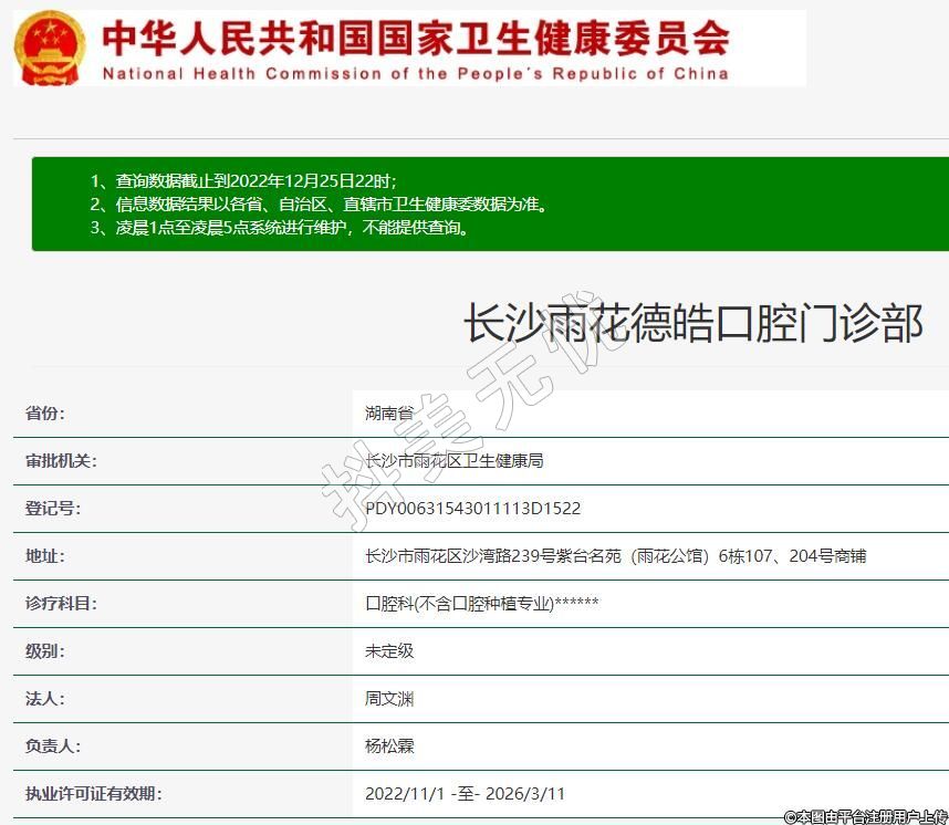 長沙雨花德皓口腔,診療科目:口腔科(不含口腔種植專業(yè))******