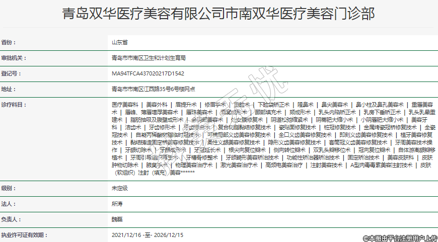 青島雙華醫(yī)療美容有限公司市南雙華醫(yī)療美容門診部