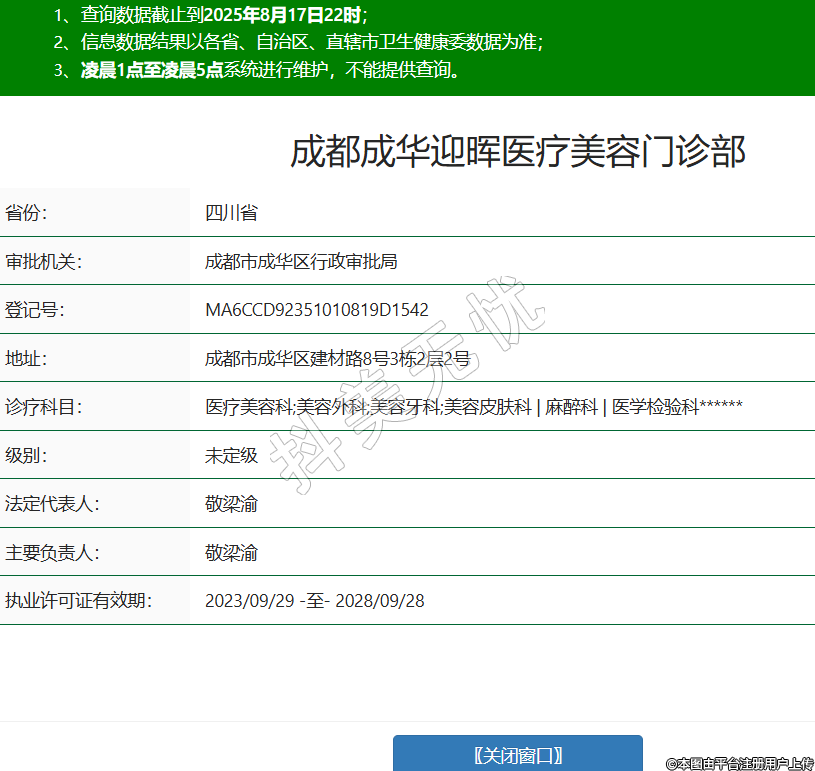 省份:四川省審批機(jī)關(guān):成都市成華區(qū)行政審批局登記號(hào):MA6CCD92351010819D1542地址:成都市成華區(qū)建材路8號(hào)3棟2層2號(hào)診療科目:醫(yī)療美容科;美容外科;美容牙科;美容皮膚科 | 麻醉科 | 醫(yī)學(xué)檢驗(yàn)科******級(jí)別:未定級(jí)法定代表人:敬梁渝主要負(fù)責(zé)人:敬梁渝執(zhí)業(yè)許可證有效期:2023/09/29 -至- 2028/09/28 -