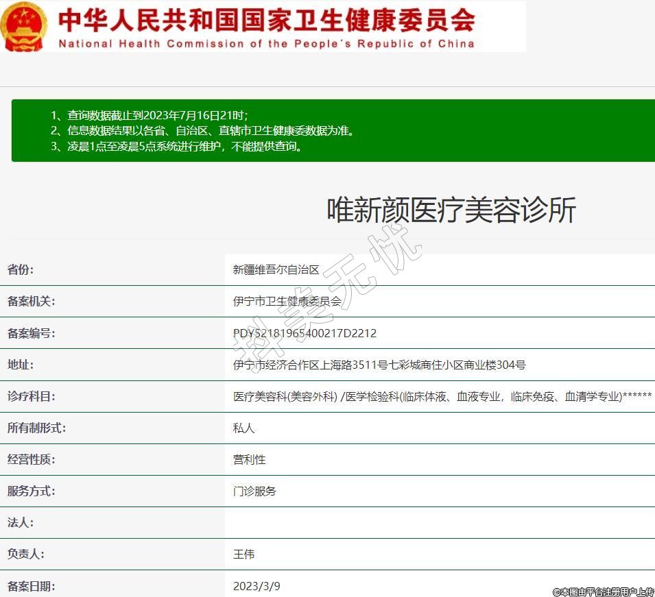 伊寧唯新顏醫(yī)療美容,診療科目:醫(yī)療美容科(美容外科) /醫(yī)學(xué)檢驗科(臨床體液、血液專業(yè),臨床免疫、血清學(xué)專業(yè))******
