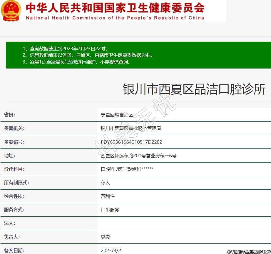 銀川品潔口腔診所,2015年成立,統(tǒng)一社信用代碼:92640105MA760JFK62,老店位于西夏區(qū)懷遠西路77號南京證券樓下,2021年新店搬遷銀川市西夏區(qū)西夏萬達十字路口,像西100米,是一家全科診所,店內開設牙體牙髓、全瓷修復,隱形矯正,種植牙等多個診療項目。