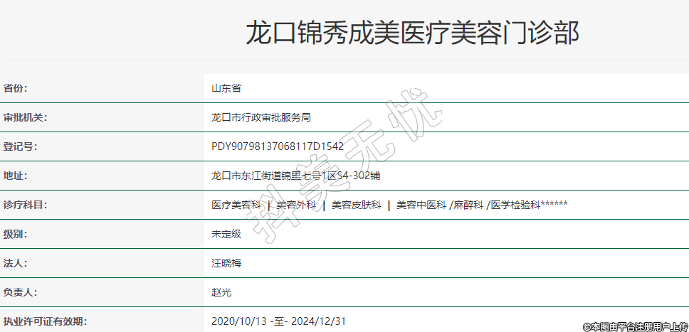 龍口錦秀成美醫(yī)療美容門診部,位于龍口市錦里七號,門診建筑面積1100余平方,是一所醫(yī)師力量較雄厚,技術(shù)水平,服務(wù)項目齊全,醫(yī)療設(shè)備較先進的醫(yī)學(xué)整容美容機構(gòu),設(shè)有整形、皮膚、無創(chuàng)、中醫(yī)、私密等科室。激光室,消毒室,無菌操作手術(shù)室,觀察室等一應(yīng)齊全。