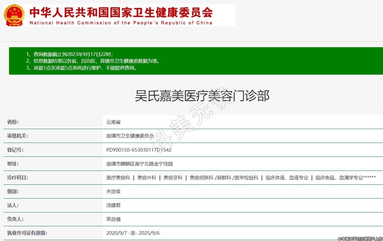 曲靖吳氏嘉美醫(yī)療美容,診療科目:醫(yī)療美容科 | 美容外科 | 美容牙科 | 美容皮膚科 /麻醉科 /醫(yī)學檢驗科 | 臨床體液、血液專業(yè) | 臨床免疫、血清學專業(yè)******