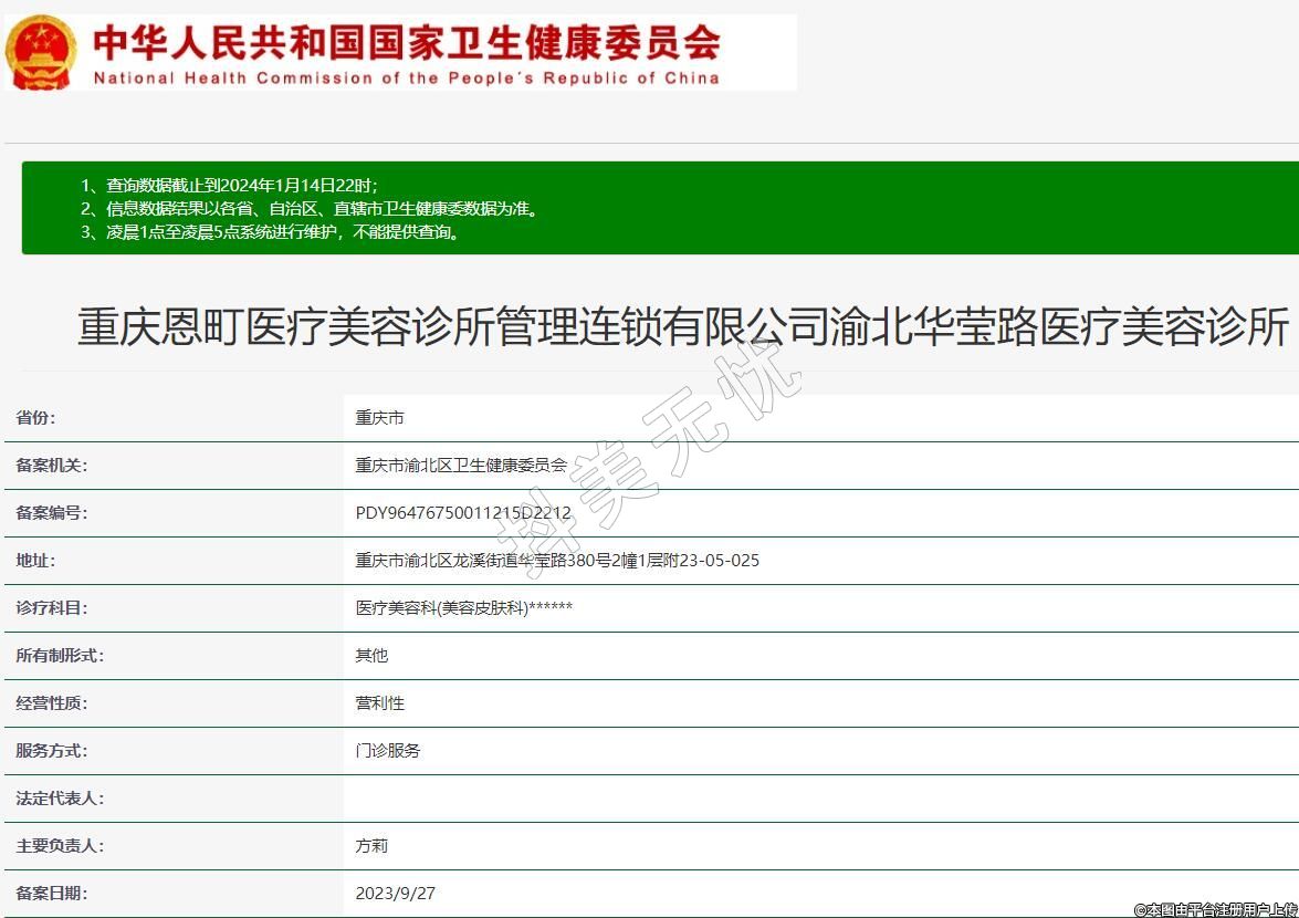 重慶恩町醫(yī)療美容診所管理連鎖有限公司渝北華瑩路醫(yī)療美容診所