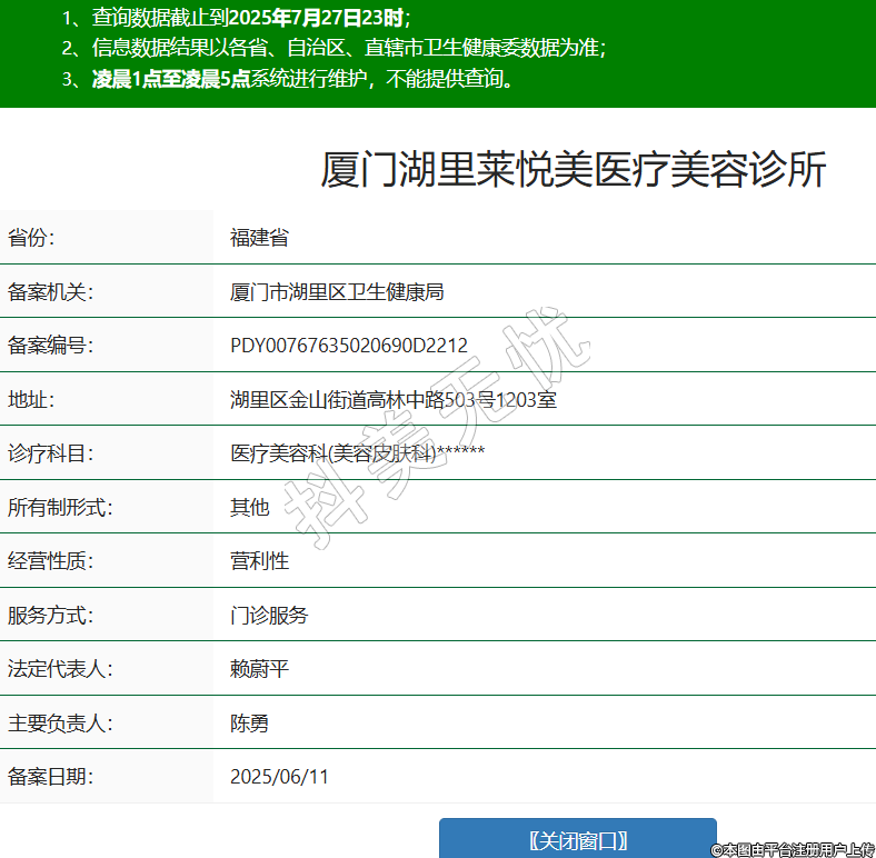 省份:福建省備案機(jī)關(guān):廈門市湖里區(qū)衛(wèi)生健康局備案編號(hào):PDY00767635020690D2212地址:湖里區(qū)金山街道高林中路503號(hào)1203室診療科目:醫(yī)療美容科(美容皮膚科)******所有制形式:其他經(jīng)營性質(zhì):營利性服務(wù)方式:門診服務(wù)法定代表人:賴蔚平主要負(fù)責(zé)人:陳勇備案日期:2025/06/11 -