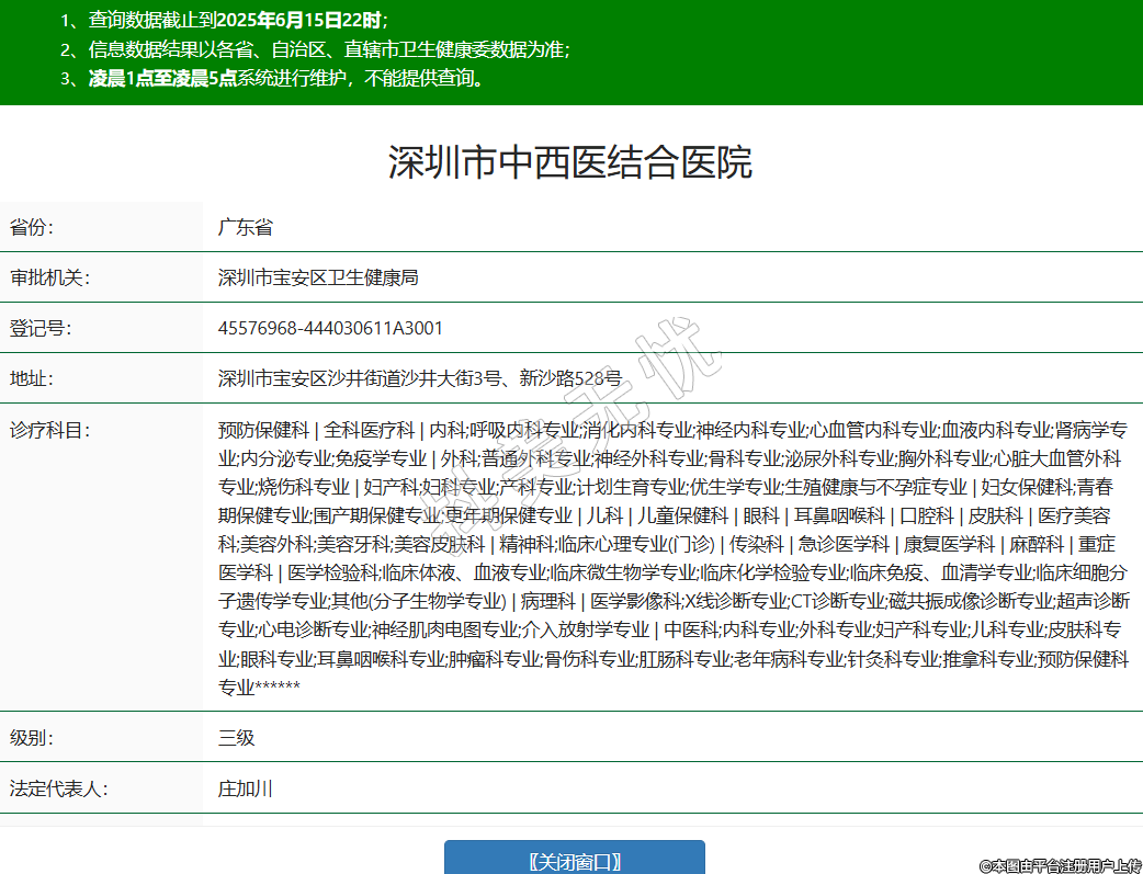 省份:廣東省審批機關(guān):深圳市寶安區(qū)衛(wèi)生健康局登記號:45576968-444030611A3001地址:深圳市寶安區(qū)沙井街道沙井大街3號、新沙路528號診療科目:預(yù)防保健科 | 全科醫(yī)療科 | 內(nèi)科;呼吸內(nèi)科專業(yè);消化內(nèi)科專業(yè);神經(jīng)內(nèi)科專業(yè);心血管內(nèi)科專業(yè);血液內(nèi)科專業(yè);腎病學(xué)專業(yè);內(nèi)分泌專業(yè);免疫學(xué)專業(yè) | 外科;普通外科專業(yè);神經(jīng)外科專業(yè);骨科專業(yè);泌尿外科專業(yè);胸外科專業(yè);心臟大血管外科專業(yè);燒傷科專業(yè) | 婦產(chǎn)科;婦科專業(yè);產(chǎn)科專業(yè);計劃生育專業(yè);優(yōu)生學(xué)專業(yè);生殖健康與不孕癥專業(yè) | 婦女保健科;青春期保健專業(yè);圍產(chǎn)期保健專業(yè);更年期保健專業(yè) | 兒科 | 兒童保健科 | 眼科 | 耳鼻咽喉科 | 口腔科 | 皮膚科 | 醫(yī)療美容科;美容外科;美容牙科;美容皮膚科 | 精神科;臨床心理專業(yè)(門診) | 傳染科 | 急診醫(yī)學(xué)科 | 康復(fù)醫(yī)學(xué)科 | 麻醉科 | 重癥醫(yī)學(xué)科 | 醫(yī)學(xué)檢驗科;臨床體液、血液專業(yè);臨床微生物學(xué)專業(yè);臨床化學(xué)檢驗專業(yè);臨床免疫、血清學(xué)專業(yè);臨床細(xì)胞分子遺傳學(xué)專業(yè);其他(分子生物學(xué)專業(yè)) | 病理科 | 醫(yī)學(xué)影像科;X線診斷專業(yè);CT診斷專業(yè);磁共振成像診斷專業(yè);超聲診斷專業(yè);心電診斷專業(yè);神經(jīng)肌肉電圖專業(yè);介入放射學(xué)專業(yè) | 中醫(yī)科;內(nèi)科專業(yè);外科專業(yè);婦產(chǎn)科專業(yè);兒科專業(yè);皮膚科專業(yè);眼科專業(yè);耳鼻咽喉科專業(yè);腫瘤科專業(yè);骨傷科專業(yè);肛腸科專業(yè);老年病科專業(yè);針灸科專業(yè);推拿科專業(yè);預(yù)防保健科專業(yè)******級別:三級法定代表人:莊加川主要負(fù)責(zé)人:***執(zhí)業(yè)許可證有效期:2020/03/31 -至- 2035/03/30 -