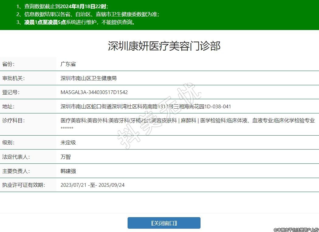 深圳康妍醫(yī)療美容門診部,診療科目:醫(yī)療美容科;美容外科;美容牙科(牙椅2臺);美容皮膚科 | 麻醉科 | 醫(yī)學檢驗科;臨床體液、血液專業(yè);臨床化學檢驗專業(yè)******
