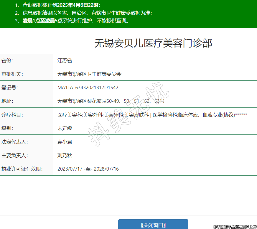 無錫安貝兒醫(yī)療美容門診部,診療科目:醫(yī)療美容科;美容外科;美容牙科;美容皮膚科 | 醫(yī)學(xué)檢驗(yàn)科;臨床體液、血液專業(yè)(協(xié)議)******