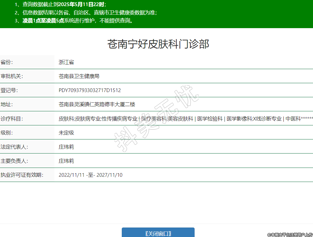 省份:浙江省審批機關:蒼南縣衛(wèi)生健康局登記號:PDY70937933032717D1512地址:蒼南縣靈溪鎮(zhèn)仁英路德豐大廈二樓診療科目:皮膚科;皮膚病專業(yè);性傳播疾病專業(yè) | 醫(yī)療美容科;美容皮膚科 | 醫(yī)學檢驗科 | 醫(yī)學影像科;X線診斷專業(yè) | 中醫(yī)科******級別:未定級法定代表人:莊瑋莉主要負責人:莊瑋莉執(zhí)業(yè)許可證有效期:2022/11/11 -至- 2027/11/10 -