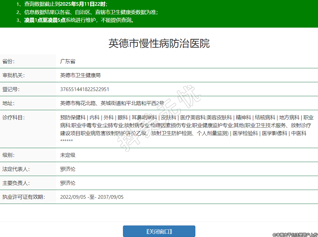 省份:廣東省審批機關:英德市衛(wèi)生健康局登記號:376551441822522951地址:英德市梅花北路、英城街道和平北路和平西2號診療科目:預防保健科 | 內(nèi)科 | 外科 | 眼科 | 耳鼻咽喉科 | 皮膚科 | 醫(yī)療美容科;美容皮膚科 | 精神科 | 結(jié)核病科 | 地方病科 | 職業(yè)病科;職業(yè)中毒專業(yè);塵肺專業(yè);放射病專業(yè);物理因素損傷專業(yè);職業(yè)健康監(jiān)護專業(yè);其他(職業(yè)衛(wèi)生技術服務、放射診療建設項目職業(yè)病危害放射防護評價乙級、放射衛(wèi)生防護檢測、個人劑量監(jiān)測) | 醫(yī)學檢驗科 | 醫(yī)學影像科 | 中醫(yī)科******級別:未定級法定代表人:羅濟倫主要負責人:羅濟倫執(zhí)業(yè)許可證有效期:2022/09/05 -至- 2037/09/05 -