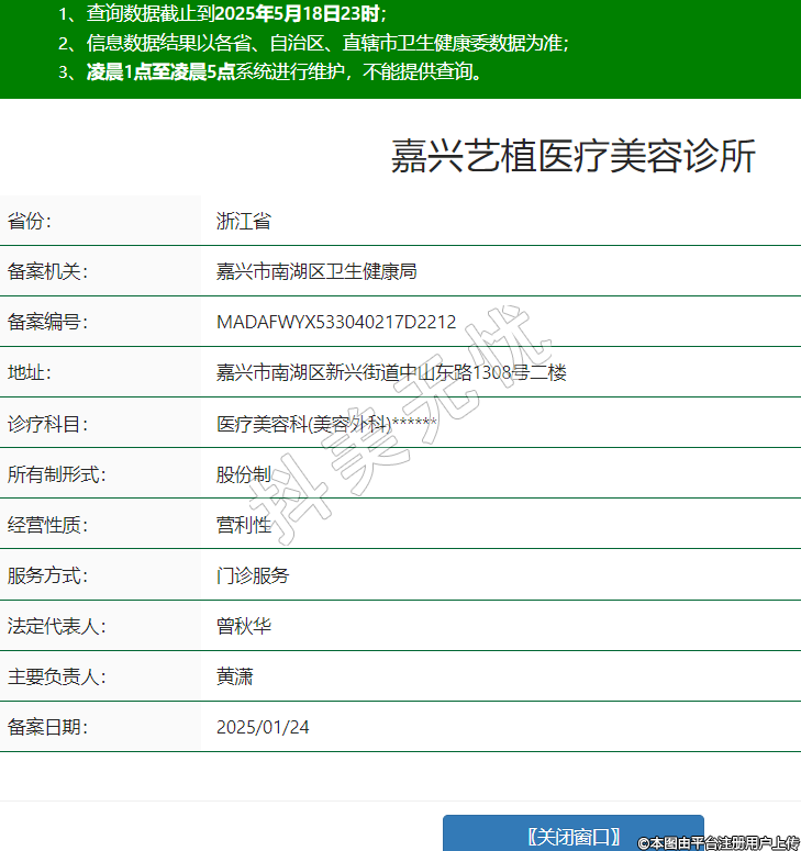 省份:浙江省備案機關(guān):嘉興市南湖區(qū)衛(wèi)生健康局備案編號:MADAFWYX533040217D2212地址:嘉興市南湖區(qū)新興街道中山東路1308號二樓診療科目:醫(yī)療美容科(美容外科)******所有制形式:股份制經(jīng)營性質(zhì):營利性服務(wù)方式:門診服務(wù)法定代表人:曾秋華主要負責(zé)人:黃瀟備案日期:2025/01/24 -