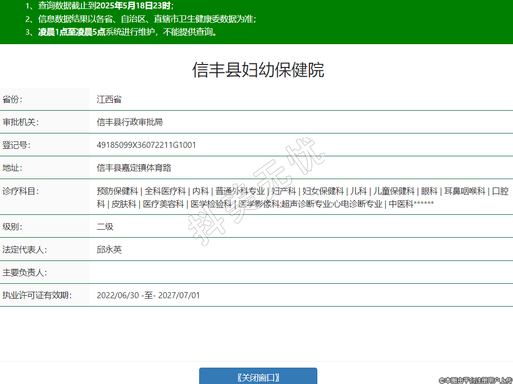 省份:江西省審批機(jī)關(guān):信豐縣行政審批局登記號(hào):49185099X36072211G1001地址:信豐縣嘉定鎮(zhèn)體育路診療科目:預(yù)防保健科 | 全科醫(yī)療科 | 內(nèi)科 | 普通外科專業(yè) | 婦產(chǎn)科 | 婦女保健科 | 兒科 | 兒童保健科 | 眼科 | 耳鼻咽喉科 | 口腔科 | 皮膚科 | 醫(yī)療美容科 | 醫(yī)學(xué)檢驗(yàn)科 | 醫(yī)學(xué)影像科;超聲診斷專業(yè);心電診斷專業(yè) | 中醫(yī)科******級(jí)別:二級(jí)法定代表人:邱永英主要負(fù)責(zé)人:執(zhí)業(yè)許可證有效期:2022/06/30 -至- 2027/07/01 -