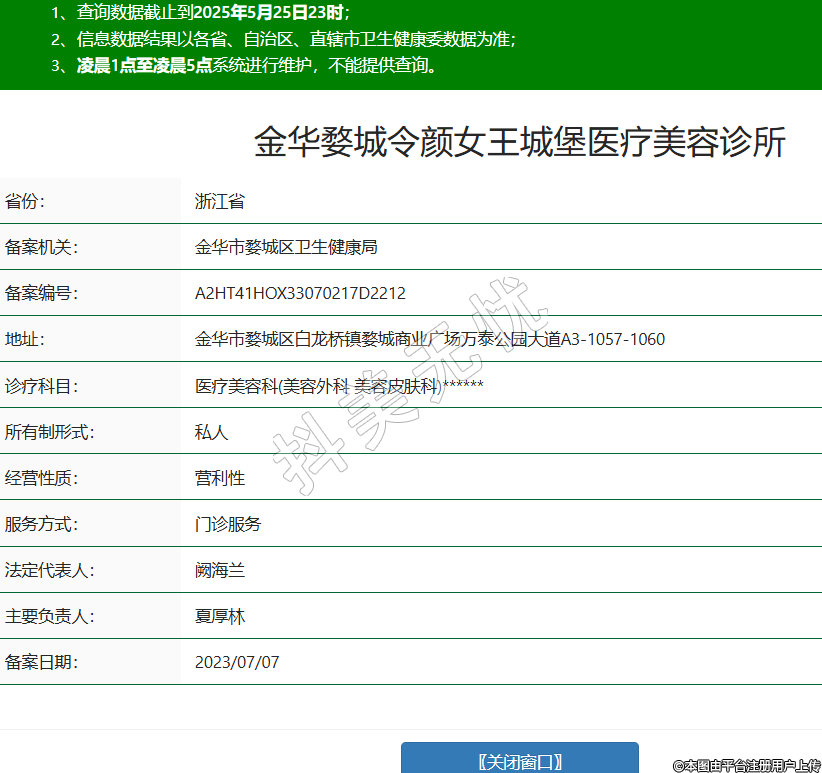 省份:浙江省備案機(jī)關(guān):金華市婺城區(qū)衛(wèi)生健康局備案編號(hào):A2HT41HOX33070217D2212地址:金華市婺城區(qū)白龍橋鎮(zhèn)婺城商業(yè)廣場(chǎng)萬泰公園大道A3-1057-1060診療科目:醫(yī)療美容科(美容外科 美容皮膚科)******所有制形式:私人經(jīng)營(yíng)性質(zhì):營(yíng)利性服務(wù)方式:門診服務(wù)法定代表人:闕海蘭主要負(fù)責(zé)人:夏厚林備案日期:2023/07/07 -