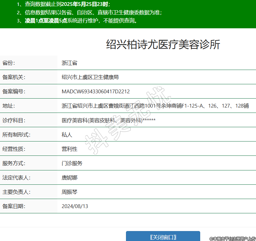 省份:浙江省備案機(jī)關(guān):紹興市上虞區(qū)衛(wèi)生健康局備案編號(hào):MADCW693433060417D2212地址:浙江省紹興市上虞區(qū)曹娥街道江西路1001號(hào)余坤商鋪F1-125-A、126、127、128鋪診療科目:醫(yī)療美容科(美容皮膚科、美容外科)******所有制形式:私人經(jīng)營(yíng)性質(zhì):營(yíng)利性服務(wù)方式:門(mén)診服務(wù)法定代表人:唐妮娜主要負(fù)責(zé)人:周振琴備案日期:2024/08/13 -