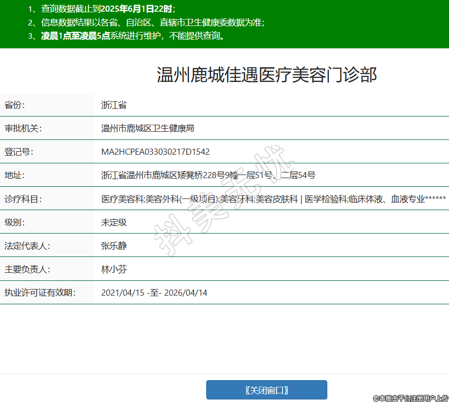 省份:浙江省審批機(jī)關(guān):溫州市鹿城區(qū)衛(wèi)生健康局登記號:MA2HCPEA033030217D1542地址:浙江省溫州市鹿城區(qū)矮凳橋228號9幢一層51號、二層54號診療科目:醫(yī)療美容科;美容外科(一級項目);美容牙科;美容皮膚科 | 醫(yī)學(xué)檢驗科;臨床體液、血液專業(yè)******級別:未定級法定代表人:張樂靜主要負(fù)責(zé)人:林小芬執(zhí)業(yè)許可證有效期:2021/04/15 -至- 2026/04/14 -