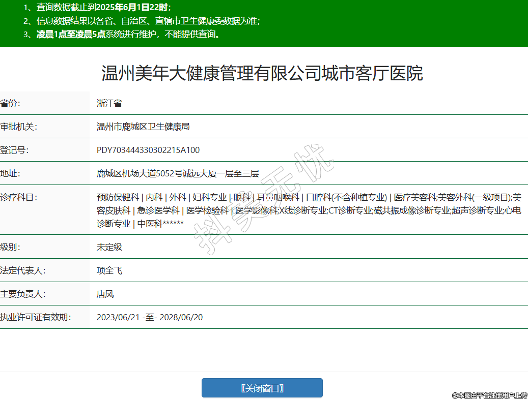 省份:浙江省審批機關(guān):溫州市鹿城區(qū)衛(wèi)生健康局登記號:PDY703444330302215A100地址:鹿城區(qū)機場大道5052號誠遠大廈一層至三層診療科目:預(yù)防保健科 | 內(nèi)科 | 外科 | 婦科專業(yè) | 眼科 | 耳鼻咽喉科 | 口腔科(不含種植專業(yè)) | 醫(yī)療美容科;美容外科(一級項目);美容皮膚科 | 急診醫(yī)學(xué)科 | 醫(yī)學(xué)檢驗科 | 醫(yī)學(xué)影像科;X線診斷專業(yè);CT診斷專業(yè);磁共振成像診斷專業(yè);超聲診斷專業(yè);心電診斷專業(yè) | 中醫(yī)科******級別:未定級法定代表人:項全飛主要負責(zé)人:唐鳳執(zhí)業(yè)許可證有效期:2023/06/21 -至- 2028/06/20 -