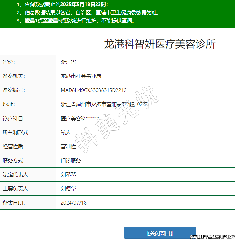 省份:浙江省備案機(jī)關(guān):龍港市社會(huì)事業(yè)局備案編號(hào):MAD8H49GX33038315D2212地址:浙江省溫州市龍港市鑫浦豪庭2幢102室診療科目:醫(yī)療美容科******所有制形式:私人經(jīng)營(yíng)性質(zhì):營(yíng)利性服務(wù)方式:門(mén)診服務(wù)法定代表人:劉琴琴主要負(fù)責(zé)人:劉德華備案日期:2024/07/18 -
