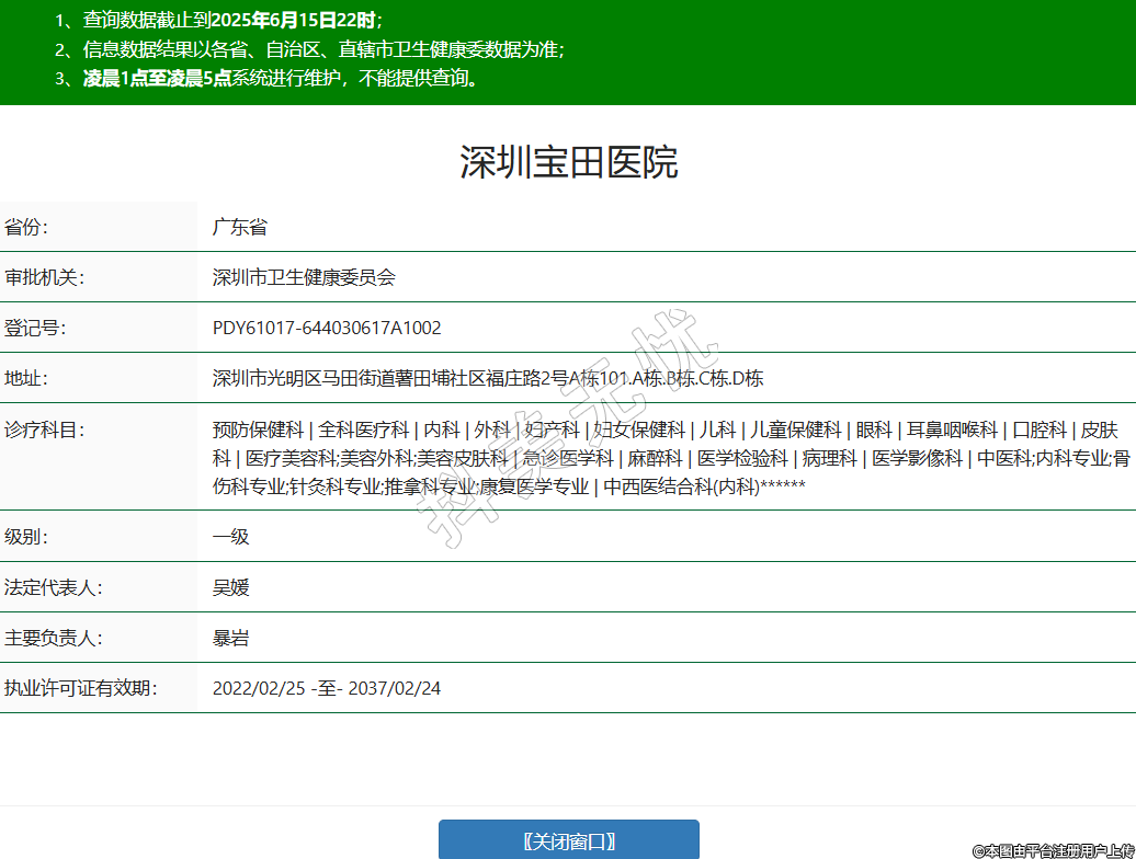 省份:廣東省審批機(jī)關(guān):深圳市衛(wèi)生健康委員會(huì)登記號(hào):PDY61017-644030617A1002地址:深圳市光明區(qū)馬田街道薯田埔社區(qū)福莊路2號(hào)A棟101.A棟.B棟.C棟.D棟診療科目:預(yù)防保健科 | 全科醫(yī)療科 | 內(nèi)科 | 外科 | 婦產(chǎn)科 | 婦女保健科 | 兒科 | 兒童保健科 | 眼科 | 耳鼻咽喉科 | 口腔科 | 皮膚科 | 醫(yī)療美容科;美容外科;美容皮膚科 | 急診醫(yī)學(xué)科 | 麻醉科 | 醫(yī)學(xué)檢驗(yàn)科 | 病理科 | 醫(yī)學(xué)影像科 | 中醫(yī)科;內(nèi)科專業(yè);骨傷科專業(yè);針灸科專業(yè);推拿科專業(yè);康復(fù)醫(yī)學(xué)專業(yè) | 中西醫(yī)結(jié)合科(內(nèi)科)******級(jí)別:一級(jí)法定代表人:吳媛主要負(fù)責(zé)人:暴巖執(zhí)業(yè)許可證有效期:2022/02/25 -至- 2037/02/24 -