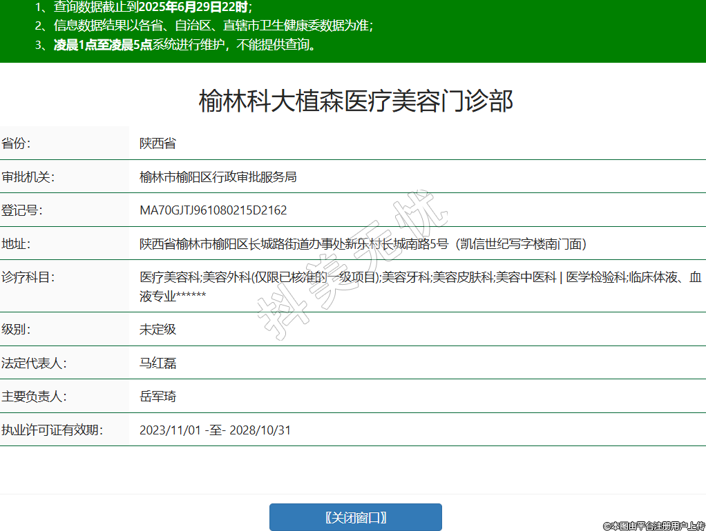 省份:陜西省審批機(jī)關(guān):榆林市榆陽(yáng)區(qū)行政審批服務(wù)局登記號(hào):MA70GJTJ961080215D2162地址:陜西省榆林市榆陽(yáng)區(qū)長(zhǎng)城路街道辦事處新樂村長(zhǎng)城南路5號(hào)(凱信世紀(jì)寫字樓南門面)診療科目:醫(yī)療美容科;美容外科(僅限已核準(zhǔn)的一級(jí)項(xiàng)目);美容牙科;美容皮膚科;美容中醫(yī)科 | 醫(yī)學(xué)檢驗(yàn)科;臨床體液、血液專業(yè)******級(jí)別:未定級(jí)法定代表人:馬紅磊主要負(fù)責(zé)人:岳軍琦執(zhí)業(yè)許可證有效期:2023/11/01 -至- 2028/10/31 -