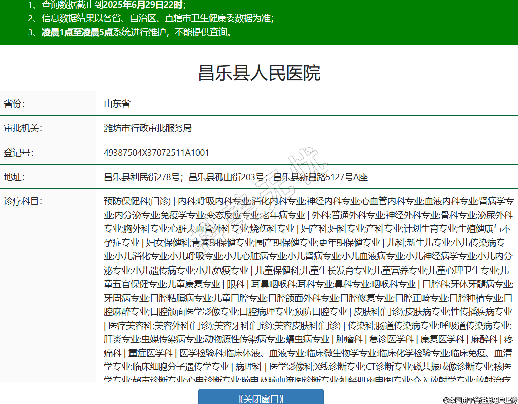 省份:山東省審批機(jī)關(guān):濰坊市行政審批服務(wù)局登記號(hào):49387504X37072511A1001地址:昌樂(lè)縣利民街278號(hào);昌樂(lè)縣孤山街203號(hào);昌樂(lè)縣新昌路5127號(hào)A座診療科目:預(yù)防保健科(門診) | 內(nèi)科;呼吸內(nèi)科專業(yè);消化內(nèi)科專業(yè);神經(jīng)內(nèi)科專業(yè);心血管內(nèi)科專業(yè);血液內(nèi)科專業(yè);腎病學(xué)專業(yè);內(nèi)分泌專業(yè);免疫學(xué)專業(yè);變態(tài)反應(yīng)專業(yè);老年病專業(yè) | 外科;普通外科專業(yè);神經(jīng)外科專業(yè);骨科專業(yè);泌尿外科專業(yè);胸外科專業(yè);心臟大血管外科專業(yè);燒傷科專業(yè) | 婦產(chǎn)科;婦科專業(yè);產(chǎn)科專業(yè);計(jì)劃生育專業(yè);生殖健康與不孕癥專業(yè) | 婦女保健科;青春期保健專業(yè);圍產(chǎn)期保健專業(yè);更年期保健專業(yè) | 兒科;新生兒專業(yè);小兒傳染病專業(yè);小兒消化專業(yè);小兒呼吸專業(yè);小兒心臟病專業(yè);小兒腎病專業(yè);小兒血液病專業(yè);小兒神經(jīng)病學(xué)專業(yè);小兒內(nèi)分泌專業(yè);小兒遺傳病專業(yè);小兒免疫專業(yè) | 兒童保健科;兒童生長(zhǎng)發(fā)育專業(yè);兒童營(yíng)養(yǎng)專業(yè);兒童心理衛(wèi)生專業(yè);兒童五官保健專業(yè);兒童康復(fù)專業(yè) | 眼科 | 耳鼻咽喉科;耳科專業(yè);鼻科專業(yè);咽喉科專業(yè) | 口腔科;牙體牙髓病專業(yè);牙周病專業(yè);口腔粘膜病專業(yè);兒童口腔專業(yè);口腔頜面外科專業(yè);口腔修復(fù)專業(yè);口腔正畸專業(yè);口腔種植專業(yè);口腔麻醉專業(yè);口腔頜面醫(yī)學(xué)影像專業(yè);口腔病理專業(yè);預(yù)防口腔專業(yè) | 皮膚科(門診);皮膚病專業(yè);性傳播疾病專業(yè) | 醫(yī)療美容科;美容外科(門診);美容牙科(門診);美容皮膚科(門診) | 傳染科;腸道傳染病專業(yè);呼吸道傳染病專業(yè);肝炎專業(yè);蟲(chóng)媒傳染病專業(yè);動(dòng)物源性傳染病專業(yè);蠕蟲(chóng)病專業(yè) | 腫瘤科 | 急診醫(yī)學(xué)科 | 康復(fù)醫(yī)學(xué)科 | 麻醉科 | 疼痛科 | 重癥醫(yī)學(xué)科 | 醫(yī)學(xué)檢驗(yàn)科;臨床體液、血液專業(yè);臨床微生物學(xué)專業(yè);臨床化學(xué)檢驗(yàn)專業(yè);臨床免疫、血清學(xué)專業(yè);臨床細(xì)胞分子遺傳學(xué)專業(yè) | 病理科 | 醫(yī)學(xué)影像科;X線診斷專業(yè);CT診斷專業(yè);磁共振成像診斷專業(yè);核醫(yī)學(xué)專業(yè);超聲診斷專業(yè);心電診斷專業(yè);腦電及腦血流圖診斷專業(yè);神經(jīng)肌肉電圖專業(yè);介入放射學(xué)專業(yè);放射治療專業(yè) | 中醫(yī)科;內(nèi)科專業(yè);推拿科專業(yè);康復(fù)醫(yī)學(xué)專業(yè)******級(jí)別:二級(jí)法定代表人:肖榮偉主要負(fù)責(zé)人:肖榮偉執(zhí)業(yè)許可證有效期:2025/01/09 -至- 2035/10/08 -
