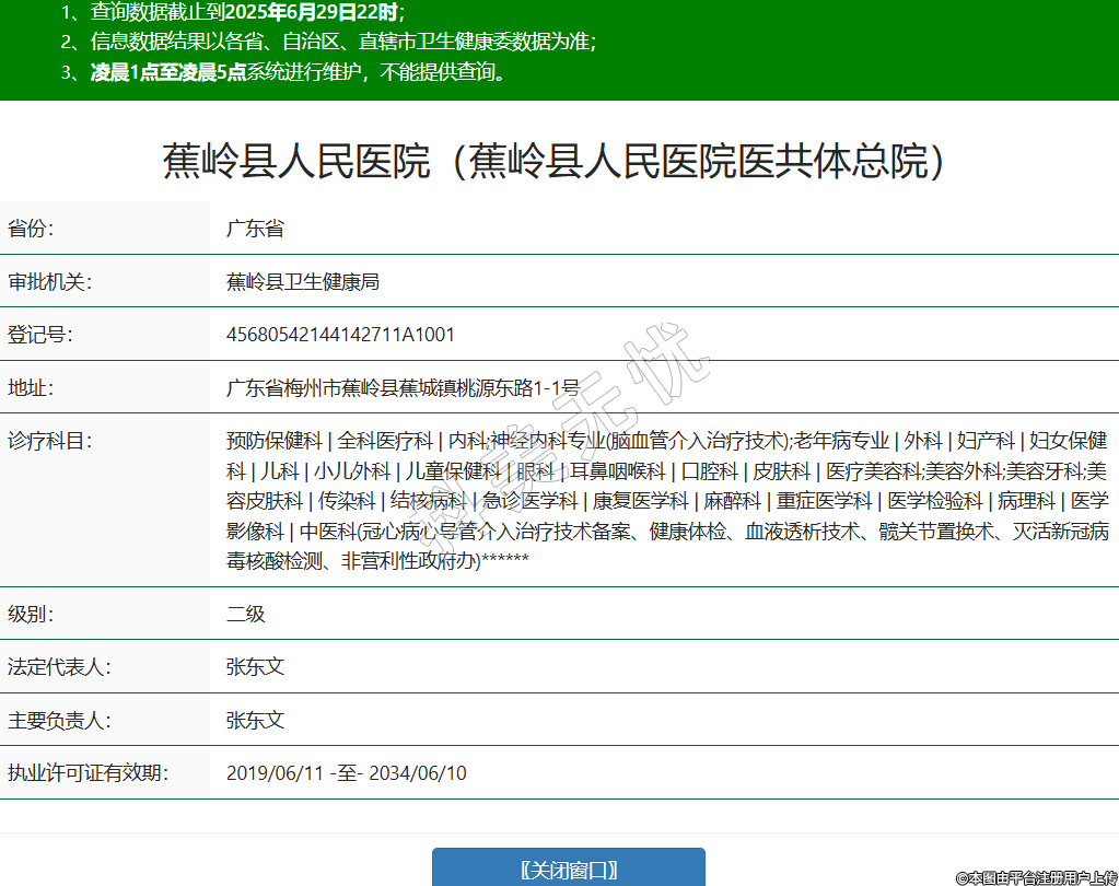 省份:廣東省審批機(jī)關(guān):蕉嶺縣衛(wèi)生健康局登記號:45680542144142711A1001地址:廣東省梅州市蕉嶺縣蕉城鎮(zhèn)桃源東路1-1號診療科目:預(yù)防保健科 | 全科醫(yī)療科 | 內(nèi)科;神經(jīng)內(nèi)科專業(yè)(腦血管介入治療技術(shù));老年病專業(yè) | 外科 | 婦產(chǎn)科 | 婦女保健科 | 兒科 | 小兒外科 | 兒童保健科 | 眼科 | 耳鼻咽喉科 | 口腔科 | 皮膚科 | 醫(yī)療美容科;美容外科;美容牙科;美容皮膚科 | 傳染科 | 結(jié)核病科 | 急診醫(yī)學(xué)科 | 康復(fù)醫(yī)學(xué)科 | 麻醉科 | 重癥醫(yī)學(xué)科 | 醫(yī)學(xué)檢驗科 | 病理科 | 醫(yī)學(xué)影像科 | 中醫(yī)科(冠心病心導(dǎo)管介入治療技術(shù)備案、健康體檢、血液透析技術(shù)、髖關(guān)節(jié)置換術(shù)、滅活新冠病毒核酸檢測、非營利性政府辦)******級別:二級法定代表人:張東文主要負(fù)責(zé)人:張東文執(zhí)業(yè)許可證有效期:2019/06/11 -至- 2034/06/10 -