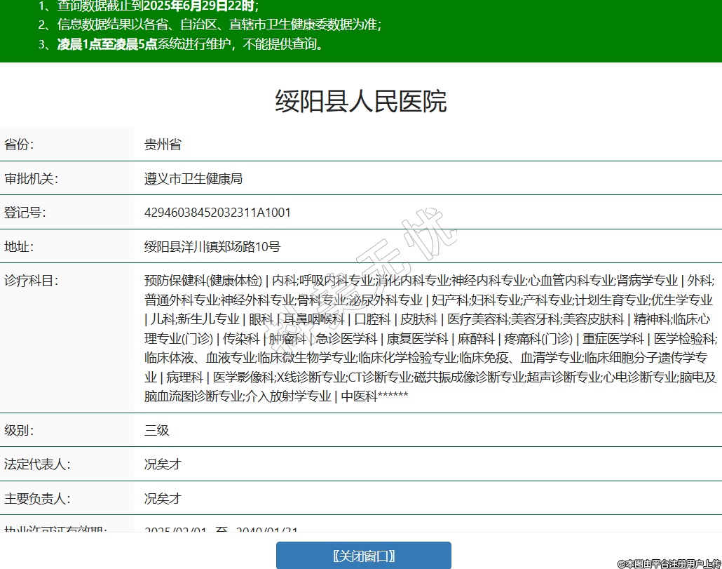 省份:貴州省審批機關(guān):遵義市衛(wèi)生健康局登記號:42946038452032311A1001地址:綏陽縣洋川鎮(zhèn)鄭場路10號診療科目:預(yù)防保健科(健康體檢) | 內(nèi)科;呼吸內(nèi)科專業(yè);消化內(nèi)科專業(yè);神經(jīng)內(nèi)科專業(yè);心血管內(nèi)科專業(yè);腎病學(xué)專業(yè) | 外科;普通外科專業(yè);神經(jīng)外科專業(yè);骨科專業(yè);泌尿外科專業(yè) | 婦產(chǎn)科;婦科專業(yè);產(chǎn)科專業(yè);計劃生育專業(yè);優(yōu)生學(xué)專業(yè) | 兒科;新生兒專業(yè) | 眼科 | 耳鼻咽喉科 | 口腔科 | 皮膚科 | 醫(yī)療美容科;美容牙科;美容皮膚科 | 精神科;臨床心理專業(yè)(門診) | 傳染科 | 腫瘤科 | 急診醫(yī)學(xué)科 | 康復(fù)醫(yī)學(xué)科 | 麻醉科 | 疼痛科(門診) | 重癥醫(yī)學(xué)科 | 醫(yī)學(xué)檢驗科;臨床體液、血液專業(yè);臨床微生物學(xué)專業(yè);臨床化學(xué)檢驗專業(yè);臨床免疫、血清學(xué)專業(yè);臨床細胞分子遺傳學(xué)專業(yè) | 病理科 | 醫(yī)學(xué)影像科;X線診斷專業(yè);CT診斷專業(yè);磁共振成像診斷專業(yè);超聲診斷專業(yè);心電診斷專業(yè);腦電及腦血流圖診斷專業(yè);介入放射學(xué)專業(yè) | 中醫(yī)科******級別:三級法定代表人:況矣才主要負責人:況矣才執(zhí)業(yè)許可證有效期:2025/02/01 -至- 2040/01/31 -