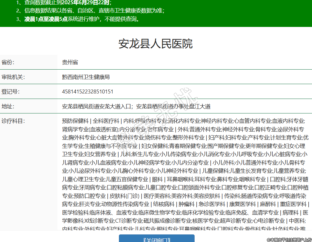 省份:貴州省審批機(jī)關(guān):黔西南州衛(wèi)生健康局登記號(hào):458141522328510151地址:安龍縣棲鳳街道安龍大道入口;安龍縣棲鳳街道辦事處盤江大道診療科目:預(yù)防保健科 | 全科醫(yī)療科 | 內(nèi)科;呼吸內(nèi)科專業(yè);消化內(nèi)科專業(yè);神經(jīng)內(nèi)科專業(yè);心血管內(nèi)科專業(yè);血液內(nèi)科專業(yè);腎病學(xué)專業(yè)(血液透析室);內(nèi)分泌專業(yè);老年病專業(yè) | 外科;普通外科專業(yè);神經(jīng)外科專業(yè);骨科專業(yè);泌尿外科專業(yè);胸外科專業(yè);心臟大血管外科專業(yè);燒傷科專業(yè);整形外科專業(yè) | 婦產(chǎn)科;婦科專業(yè);產(chǎn)科專業(yè);計(jì)劃生育專業(yè);優(yōu)生學(xué)專業(yè);生殖健康與不孕癥專業(yè) | 婦女保健科;青春期保健專業(yè);圍產(chǎn)期保健專業(yè);更年期保健專業(yè);婦女心理衛(wèi)生專業(yè);婦女營(yíng)養(yǎng)專業(yè) | 兒科;新生兒專業(yè);小兒傳染病專業(yè);小兒消化專業(yè);小兒呼吸專業(yè);小兒心臟病專業(yè);小兒腎病專業(yè);小兒血液病專業(yè);小兒神經(jīng)病學(xué)專業(yè);小兒內(nèi)分泌專業(yè) | 小兒外科;小兒普通外科專業(yè);小兒骨科專業(yè);小兒泌尿外科專業(yè);小兒胸心外科專業(yè);小兒神經(jīng)外科專業(yè) | 兒童保健科;兒童生長(zhǎng)發(fā)育專業(yè);兒童營(yíng)養(yǎng)專業(yè);兒童心理衛(wèi)生專業(yè);兒童五官保健專業(yè) | 眼科 | 耳鼻咽喉科;耳科專業(yè);鼻科專業(yè);咽喉科專業(yè) | 口腔科;牙體牙髓病專業(yè);牙周病專業(yè);口腔粘膜病專業(yè);兒童口腔專業(yè);口腔頜面外科專業(yè);口腔修復(fù)專業(yè);口腔正畸專業(yè);口腔種植專業(yè);預(yù)防口腔專業(yè) | 皮膚科(門診) | 醫(yī)療美容科;美容外科;美容皮膚科 | 傳染科;腸道傳染病專業(yè);呼吸道傳染病專業(yè);肝炎專業(yè);動(dòng)物源性傳染病專業(yè) | 結(jié)核病科 | 腫瘤科 | 急診醫(yī)學(xué)科 | 康復(fù)醫(yī)學(xué)科 | 麻醉科 | 重癥醫(yī)學(xué)科 | 醫(yī)學(xué)檢驗(yàn)科;臨床體液、血液專業(yè);臨床微生物學(xué)專業(yè);臨床化學(xué)檢驗(yàn)專業(yè);臨床免疫、血清學(xué)專業(yè) | 病理科 | 醫(yī)學(xué)影像科;X線診斷專業(yè);CT診斷專業(yè);磁共振成像診斷專業(yè);核醫(yī)學(xué)專業(yè);超聲診斷專業(yè);心電診斷專業(yè) | 中醫(yī)科;內(nèi)科專業(yè);外科專業(yè);婦產(chǎn)科專業(yè);兒科專業(yè);眼科專業(yè);耳鼻咽喉科專業(yè);口腔科專業(yè);骨傷科專業(yè);針灸科專業(yè);推拿科專業(yè);康復(fù)醫(yī)學(xué)專業(yè);急診科專業(yè);預(yù)防保健科專業(yè) | 中西醫(yī)結(jié)合科******級(jí)別:二級(jí)法定代表人:謝勇主要負(fù)責(zé)人:謝勇執(zhí)業(yè)許可證有效期:2014/10/14 -至- 2029/10/13 -