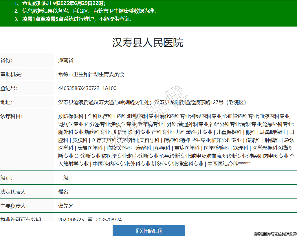 省份:湖南省審批機關:常德市衛(wèi)生和計劃生育委員會登記號:44653586X43072211A1001地址:漢壽縣滄浪街道漢壽大道與嶺湖路交匯處;漢壽縣龍陽街道滄浪東路127號(老院區(qū))診療科目:預防保健科 | 全科醫(yī)療科 | 內(nèi)科;呼吸內(nèi)科專業(yè);消化內(nèi)科專業(yè);神經(jīng)內(nèi)科專業(yè);心血管內(nèi)科專業(yè);血液內(nèi)科專業(yè);腎病學專業(yè);內(nèi)分泌專業(yè);免疫學專業(yè);老年病專業(yè) | 外科;普通外科專業(yè);神經(jīng)外科專業(yè);骨科專業(yè);泌尿外科專業(yè);胸外科專業(yè);燒傷科專業(yè) | 婦產(chǎn)科;婦科專業(yè);產(chǎn)科專業(yè) | 兒科;新生兒專業(yè) | 兒童保健科 | 眼科 | 耳鼻咽喉科 | 口腔科 | 皮膚科 | 醫(yī)療美容科;美容外科;美容牙科 | 精神科;精神衛(wèi)生專業(yè);臨床心理專業(yè) | 傳染科 | 腫瘤科 | 急診醫(yī)學科 | 康復醫(yī)學科 | 臨終關懷科 | 麻醉科 | 疼痛科 | 重癥醫(yī)學科 | 醫(yī)學檢驗科 | 病理科 | 醫(yī)學影像科;X線診斷專業(yè);CT診斷專業(yè);核醫(yī)學專業(yè);超聲診斷專業(yè);心電診斷專業(yè);腦電及腦血流圖診斷專業(yè);神經(jīng)肌肉電圖專業(yè);介入放射學專業(yè) | 中醫(yī)科;內(nèi)科專業(yè);外科專業(yè);針灸科專業(yè);推拿科專業(yè) | 中西醫(yī)結合科******級別:三級法定代表人:盛名主要負責人:張先冬執(zhí)業(yè)許可證有效期:2020/08/25 -至- 2035/08/24 -