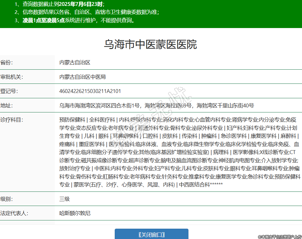 省份:內(nèi)蒙古自治區(qū)審批機關(guān):內(nèi)蒙古自治區(qū)中醫(yī)局登記號:46024226215030211A2101地址:烏海市海渤灣區(qū)濱河區(qū)四合木街1號,海勃灣區(qū)海拉路69號,海勃灣區(qū)千里山東街40號診療科目:預(yù)防保健科 | 全科醫(yī)療科 | 內(nèi)科;呼吸內(nèi)科專業(yè);消化內(nèi)科專業(yè);心血管內(nèi)科專業(yè);腎病學(xué)專業(yè);內(nèi)分泌專業(yè);免疫學(xué)專業(yè);變態(tài)反應(yīng)專業(yè);老年病專業(yè) | 普通外科專業(yè);骨科專業(yè);泌尿外科專業(yè) | 婦產(chǎn)科;婦科專業(yè);產(chǎn)科專業(yè);計劃生育專業(yè) | 兒科 | 眼科 | 耳鼻咽喉科 | 口腔科 | 皮膚科 | 傳染科 | 腫瘤科 | 急診醫(yī)學(xué)科 | 康復(fù)醫(yī)學(xué)科 | 麻醉科 | 疼痛科 | 重癥醫(yī)學(xué)科 | 醫(yī)學(xué)檢驗科;臨床體液、血液專業(yè);臨床微生物學(xué)專業(yè);臨床化學(xué)檢驗專業(yè);臨床免疫、血清學(xué)專業(yè);臨床細(xì)胞分子遺傳學(xué)專業(yè);其他(臨床基因擴(kuò)增檢驗實驗室) | 病理科 | 醫(yī)學(xué)影像科;X線診斷專業(yè);CT診斷專業(yè);磁共振成像診斷專業(yè);超聲診斷專業(yè);腦電及腦血流圖診斷專業(yè);神經(jīng)肌肉電圖專業(yè);介入放射學(xué)專業(yè);放射治療專業(yè) | 中醫(yī)科;內(nèi)科專業(yè);外科專業(yè);婦產(chǎn)科專業(yè);兒科專業(yè);皮膚科專業(yè);眼科專業(yè);耳鼻咽喉科專業(yè);腫瘤科專業(yè);骨傷科專業(yè);肛腸科專業(yè);老年病科專業(yè);針灸科專業(yè);推拿科專業(yè);康復(fù)醫(yī)學(xué)專業(yè);急診科專業(yè);預(yù)防保健科專業(yè) | 蒙醫(yī)學(xué)(五療、沙療、心身醫(yī)學(xué)、風(fēng)濕、內(nèi)科) | 中西醫(yī)結(jié)合科******級別:三級法定代表人:哈斯額爾敦尼主要負(fù)責(zé)人:哈斯額爾敦尼執(zhí)業(yè)許可證有效期:2025/05/30 -至- 2028/05/30 -