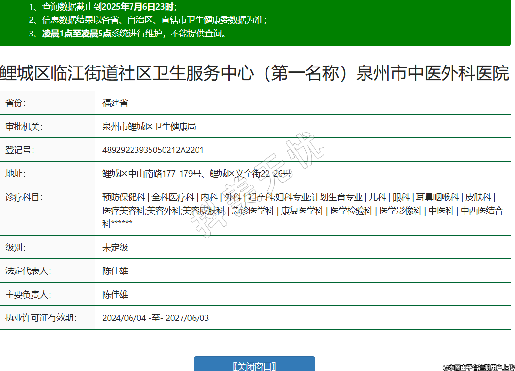 省份:福建省審批機(jī)關(guān):泉州市鯉城區(qū)衛(wèi)生健康局登記號(hào):48929223935050212A2201地址:鯉城區(qū)中山南路177-179號(hào)、鯉城區(qū)義全街22-26號(hào)診療科目:預(yù)防保健科 | 全科醫(yī)療科 | 內(nèi)科 | 外科 | 婦產(chǎn)科;婦科專業(yè);計(jì)劃生育專業(yè) | 兒科 | 眼科 | 耳鼻咽喉科 | 皮膚科 | 醫(yī)療美容科;美容外科;美容皮膚科 | 急診醫(yī)學(xué)科 | 康復(fù)醫(yī)學(xué)科 | 醫(yī)學(xué)檢驗(yàn)科 | 醫(yī)學(xué)影像科 | 中醫(yī)科 | 中西醫(yī)結(jié)合科******級(jí)別:未定級(jí)法定代表人:陳佳雄主要負(fù)責(zé)人:陳佳雄執(zhí)業(yè)許可證有效期:2024/06/04 -至- 2027/06/03 -