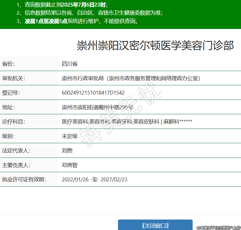 省份:四川省審批機關(guān):崇州市行政審批局(崇州市政務(wù)服務(wù)管理和網(wǎng)絡(luò)理政辦公室)登記號:60024912151018417D1542地址:崇州市崇陽街道蜀州中路299號診療科目:醫(yī)療美容科;美容外科;美容牙科;美容皮膚科 | 麻醉科******級別:未定級法定代表人:劉煦主要負責人:鄧典智執(zhí)業(yè)許可證有效期:2022/01/26 -至- 2027/02/23 -