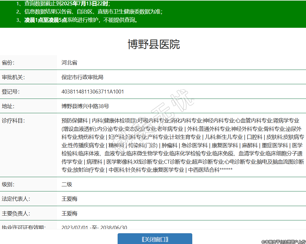 省份:河北省審批機關(guān):保定市行政審批局登記號:40381148113063711A1001地址:博野縣博興中路38號診療科目:預防保健科 | 內(nèi)科(健康體檢項目);呼吸內(nèi)科專業(yè);消化內(nèi)科專業(yè);神經(jīng)內(nèi)科專業(yè);心血管內(nèi)科專業(yè);腎病學專業(yè)(增設血液透析);內(nèi)分泌專業(yè);變態(tài)反應專業(yè);老年病專業(yè) | 外科;普通外科專業(yè);神經(jīng)外科專業(yè);骨科專業(yè);泌尿外科專業(yè);燒傷科專業(yè) | 婦產(chǎn)科;婦科專業(yè);產(chǎn)科專業(yè);計劃生育專業(yè) | 兒科;新生兒專業(yè) | 口腔科 | 皮膚科;皮膚病專業(yè);性傳播疾病專業(yè) | 精神科 | 傳染科(門診) | 腫瘤科 | 急診醫(yī)學科 | 康復醫(yī)學科 | 麻醉科 | 重癥醫(yī)學科 | 醫(yī)學檢驗科;臨床體液、血液專業(yè);臨床微生物學專業(yè);臨床化學檢驗專業(yè);臨床免疫、血清學專業(yè);臨床細胞分子遺傳學專業(yè) | 病理科 | 醫(yī)學影像科;X線診斷專業(yè);CT診斷專業(yè);超聲診斷專業(yè);心電診斷專業(yè);腦電及腦血流圖診斷專業(yè);放射治療專業(yè) | 中醫(yī)科;針灸科專業(yè);康復醫(yī)學專業(yè) | 中西醫(yī)結(jié)合科******級別:二級法定代表人:王愛梅主要負責人:王愛梅執(zhí)業(yè)許可證有效期:2023/07/01 -至- 2038/06/30 -