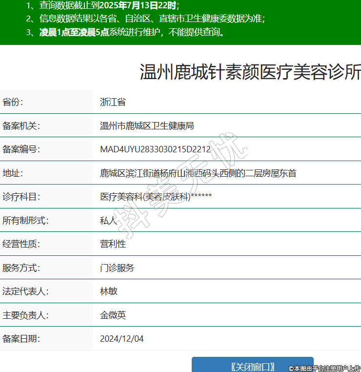 省份:浙江省備案機(jī)關(guān):溫州市鹿城區(qū)衛(wèi)生健康局備案編號(hào):MAD4UYU2833030215D2212地址:鹿城區(qū)濱江街道楊府山浦西碼頭西側(cè)的二層房屋東首診療科目:醫(yī)療美容科(美容皮膚科)******所有制形式:私人經(jīng)營(yíng)性質(zhì):營(yíng)利性服務(wù)方式:門(mén)診服務(wù)法定代表人:林敏主要負(fù)責(zé)人:金微英備案日期:2024/12/04 -