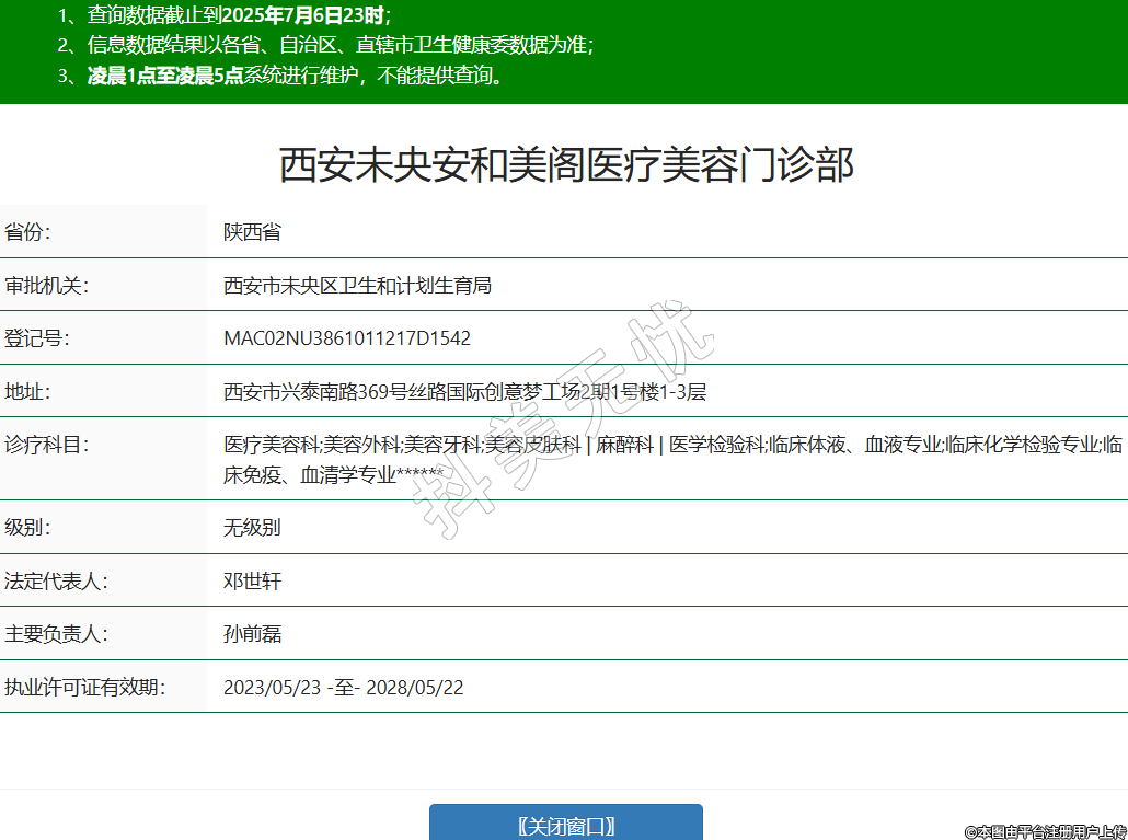 省份:陜西省審批機(jī)關(guān):西安市未央?yún)^(qū)衛(wèi)生和計(jì)劃生育局登記號(hào):MAC02NU3861011217D1542地址:西安市興泰南路369號(hào)絲路國際創(chuàng)意夢(mèng)工場(chǎng)2期1號(hào)樓1-3層診療科目:醫(yī)療美容科;美容外科;美容牙科;美容皮膚科 | 麻醉科 | 醫(yī)學(xué)檢驗(yàn)科;臨床體液、血液專業(yè);臨床化學(xué)檢驗(yàn)專業(yè);臨床免疫、血清學(xué)專業(yè)******級(jí)別:無級(jí)別法定代表人:鄧世軒主要負(fù)責(zé)人:孫前磊執(zhí)業(yè)許可證有效期:2023/05/23 -至- 2028/05/22 -