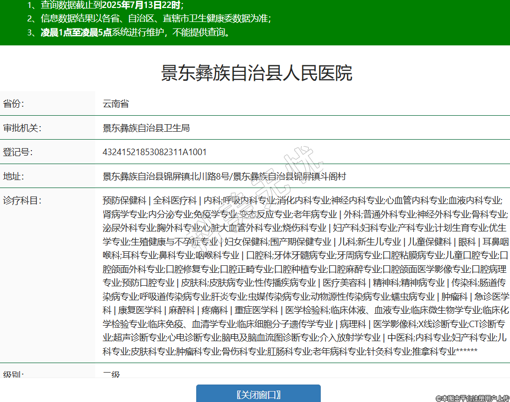 省份:云南省審批機(jī)關(guān):景東彝族自治縣衛(wèi)生局登記號(hào):43241521853082311A1001地址:景東彝族自治縣錦屏鎮(zhèn)北川路8號(hào)/景東彝族自治縣錦屏鎮(zhèn)斗閣村診療科目:預(yù)防保健科 | 全科醫(yī)療科 | 內(nèi)科;呼吸內(nèi)科專業(yè);消化內(nèi)科專業(yè);神經(jīng)內(nèi)科專業(yè);心血管內(nèi)科專業(yè);血液內(nèi)科專業(yè);腎病學(xué)專業(yè);內(nèi)分泌專業(yè);免疫學(xué)專業(yè);變態(tài)反應(yīng)專業(yè);老年病專業(yè) | 外科;普通外科專業(yè);神經(jīng)外科專業(yè);骨科專業(yè);泌尿外科專業(yè);胸外科專業(yè);心臟大血管外科專業(yè);燒傷科專業(yè) | 婦產(chǎn)科;婦科專業(yè);產(chǎn)科專業(yè);計(jì)劃生育專業(yè);優(yōu)生學(xué)專業(yè);生殖健康與不孕癥專業(yè) | 婦女保健科;圍產(chǎn)期保健專業(yè) | 兒科;新生兒專業(yè) | 兒童保健科 | 眼科 | 耳鼻咽喉科;耳科專業(yè);鼻科專業(yè);咽喉科專業(yè) | 口腔科;牙體牙髓病專業(yè);牙周病專業(yè);口腔粘膜病專業(yè);兒童口腔專業(yè);口腔頜面外科專業(yè);口腔修復(fù)專業(yè);口腔正畸專業(yè);口腔種植專業(yè);口腔麻醉專業(yè);口腔頜面醫(yī)學(xué)影像專業(yè);口腔病理專業(yè);預(yù)防口腔專業(yè) | 皮膚科;皮膚病專業(yè);性傳播疾病專業(yè) | 醫(yī)療美容科 | 精神科;精神病專業(yè) | 傳染科;腸道傳染病專業(yè);呼吸道傳染病專業(yè);肝炎專業(yè);蟲(chóng)媒傳染病專業(yè);動(dòng)物源性傳染病專業(yè);蠕蟲(chóng)病專業(yè) | 腫瘤科 | 急診醫(yī)學(xué)科 | 康復(fù)醫(yī)學(xué)科 | 麻醉科 | 疼痛科 | 重癥醫(yī)學(xué)科 | 醫(yī)學(xué)檢驗(yàn)科;臨床體液、血液專業(yè);臨床微生物學(xué)專業(yè);臨床化學(xué)檢驗(yàn)專業(yè);臨床免疫、血清學(xué)專業(yè);臨床細(xì)胞分子遺傳學(xué)專業(yè) | 病理科 | 醫(yī)學(xué)影像科;X線診斷專業(yè);CT診斷專業(yè);超聲診斷專業(yè);心電診斷專業(yè);腦電及腦血流圖診斷專業(yè);介入放射學(xué)專業(yè) | 中醫(yī)科;內(nèi)科專業(yè);婦產(chǎn)科專業(yè);兒科專業(yè);皮膚科專業(yè);腫瘤科專業(yè);骨傷科專業(yè);肛腸科專業(yè);老年病科專業(yè);針灸科專業(yè);推拿科專業(yè)******級(jí)別:二級(jí)法定代表人:馮周亮主要負(fù)責(zé)人:馮周亮執(zhí)業(yè)許可證有效期:2010/08/22 -至- 2025/08/21 -