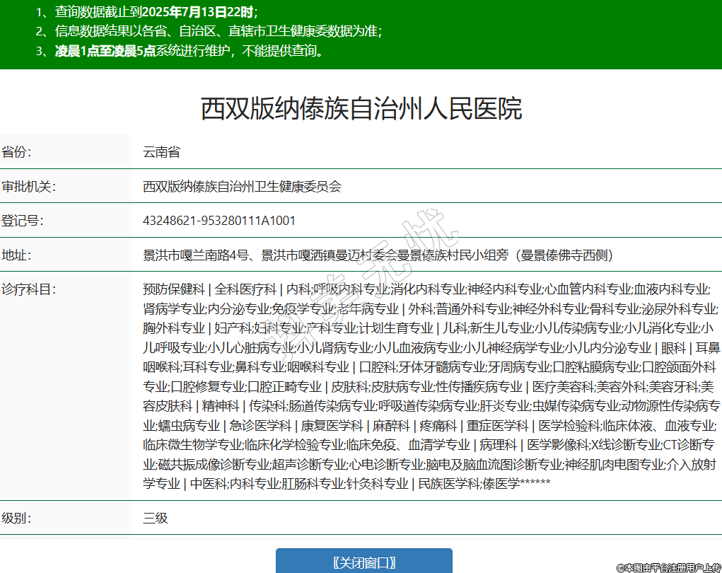 省份:云南省審批機(jī)關(guān):西雙版納傣族自治州衛(wèi)生健康委員會(huì)登記號(hào):43248621-953280111A1001地址:景洪市嘎蘭南路4號(hào)、景洪市嘎灑鎮(zhèn)曼邁村委會(huì)曼景傣族村民小組旁(曼景傣佛寺西側(cè))診療科目:預(yù)防保健科 | 全科醫(yī)療科 | 內(nèi)科;呼吸內(nèi)科專業(yè);消化內(nèi)科專業(yè);神經(jīng)內(nèi)科專業(yè);心血管內(nèi)科專業(yè);血液內(nèi)科專業(yè);腎病學(xué)專業(yè);內(nèi)分泌專業(yè);免疫學(xué)專業(yè);老年病專業(yè) | 外科;普通外科專業(yè);神經(jīng)外科專業(yè);骨科專業(yè);泌尿外科專業(yè);胸外科專業(yè) | 婦產(chǎn)科;婦科專業(yè);產(chǎn)科專業(yè);計(jì)劃生育專業(yè) | 兒科;新生兒專業(yè);小兒傳染病專業(yè);小兒消化專業(yè);小兒呼吸專業(yè);小兒心臟病專業(yè);小兒腎病專業(yè);小兒血液病專業(yè);小兒神經(jīng)病學(xué)專業(yè);小兒內(nèi)分泌專業(yè) | 眼科 | 耳鼻咽喉科;耳科專業(yè);鼻科專業(yè);咽喉科專業(yè) | 口腔科;牙體牙髓病專業(yè);牙周病專業(yè);口腔粘膜病專業(yè);口腔頜面外科專業(yè);口腔修復(fù)專業(yè);口腔正畸專業(yè) | 皮膚科;皮膚病專業(yè);性傳播疾病專業(yè) | 醫(yī)療美容科;美容外科;美容牙科;美容皮膚科 | 精神科 | 傳染科;腸道傳染病專業(yè);呼吸道傳染病專業(yè);肝炎專業(yè);蟲媒傳染病專業(yè);動(dòng)物源性傳染病專業(yè);蠕蟲病專業(yè) | 急診醫(yī)學(xué)科 | 康復(fù)醫(yī)學(xué)科 | 麻醉科 | 疼痛科 | 重癥醫(yī)學(xué)科 | 醫(yī)學(xué)檢驗(yàn)科;臨床體液、血液專業(yè);臨床微生物學(xué)專業(yè);臨床化學(xué)檢驗(yàn)專業(yè);臨床免疫、血清學(xué)專業(yè) | 病理科 | 醫(yī)學(xué)影像科;X線診斷專業(yè);CT診斷專業(yè);磁共振成像診斷專業(yè);超聲診斷專業(yè);心電診斷專業(yè);腦電及腦血流圖診斷專業(yè);神經(jīng)肌肉電圖專業(yè);介入放射學(xué)專業(yè) | 中醫(yī)科;內(nèi)科專業(yè);肛腸科專業(yè);針灸科專業(yè) | 民族醫(yī)學(xué)科;傣醫(yī)學(xué)******級(jí)別:三級(jí)法定代表人:劉平華主要負(fù)責(zé)人:劉平華執(zhí)業(yè)許可證有效期:2024/11/05 -至- 2039/11/04 -