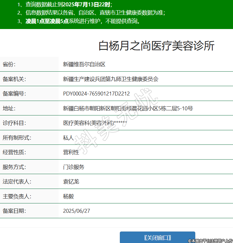 省份:新疆維吾爾自治區(qū)備案機(jī)關(guān):新疆生產(chǎn)建設(shè)兵團(tuán)第九師衛(wèi)生健康委員會(huì)備案編號(hào):PDY00024-765901217D2212地址:新疆白楊市朝陽(yáng)新區(qū)朝陽(yáng)街綠晨花園小區(qū)5棟二層5-10號(hào)診療科目:醫(yī)療美容科(美容外科)******所有制形式:私人經(jīng)營(yíng)性質(zhì):營(yíng)利性服務(wù)方式:門診服務(wù)法定代表人:袁釔龍主要負(fù)責(zé)人:楊毅備案日期:2025/06/27 -