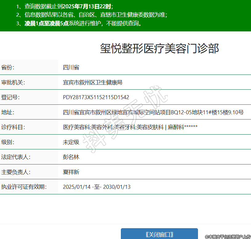 省份:四川省審批機(jī)關(guān):宜賓市敘州區(qū)衛(wèi)生健康局登記號:PDY28173X51152115D1542地址:四川省宜賓市敘州區(qū)綠地宜賓城際空間站項(xiàng)目BQ12-05地塊11#樓15樓9.10號診療科目:醫(yī)療美容科;美容外科;美容牙科;美容皮膚科 | 麻醉科******級別:未定級法定代表人:彭名林主要負(fù)責(zé)人:夏祥新執(zhí)業(yè)許可證有效期:2025/01/14 -至- 2030/01/13 -