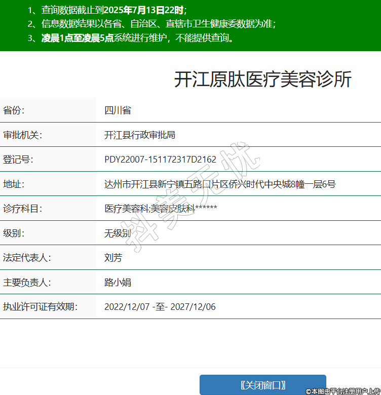 省份:四川省審批機(jī)關(guān):開(kāi)江縣行政審批局登記號(hào):PDY22007-151172317D2162地址:達(dá)州市開(kāi)江縣新寧鎮(zhèn)五路口片區(qū)僑興時(shí)代中央城8幢一層6號(hào)診療科目:醫(yī)療美容科;美容皮膚科******級(jí)別:無(wú)級(jí)別法定代表人:劉芳主要負(fù)責(zé)人:路小娟執(zhí)業(yè)許可證有效期:2022/12/07 -至- 2027/12/06 -