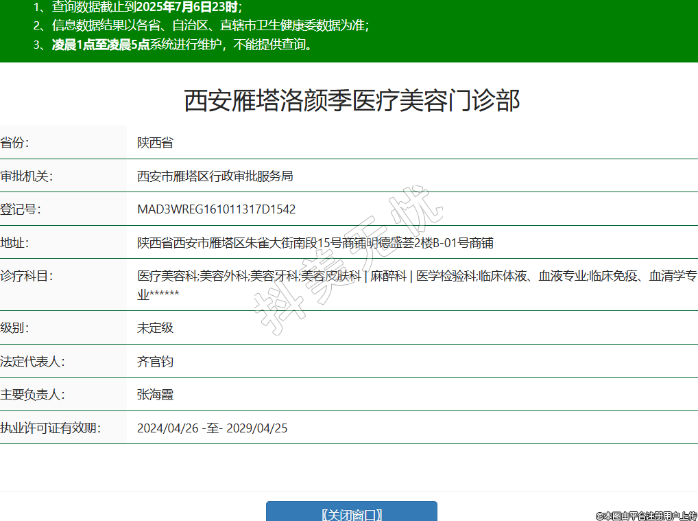 省份:陜西省審批機關(guān):西安市雁塔區(qū)行政審批服務局登記號:MAD3WREG161011317D1542地址:陜西省西安市雁塔區(qū)朱雀大街南段15號商鋪明德盛薈2樓B-01號商鋪診療科目:醫(yī)療美容科;美容外科;美容牙科;美容皮膚科 | 麻醉科 | 醫(yī)學檢驗科;臨床體液、血液專業(yè);臨床免疫、血清學專業(yè)******級別:未定級法定代表人:齊官鈞主要負責人:張海霞執(zhí)業(yè)許可證有效期:2024/04/26 -至- 2029/04/25 -