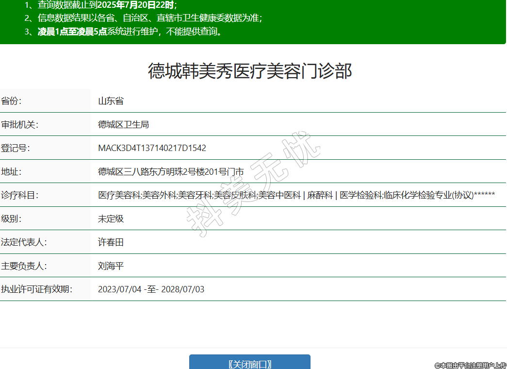 省份:山東省審批機關(guān):德城區(qū)衛(wèi)生局登記號:MACK3D4T137140217D1542地址:德城區(qū)三八路東方明珠2號樓201號門市診療科目:醫(yī)療美容科;美容外科;美容牙科;美容皮膚科;美容中醫(yī)科 | 麻醉科 | 醫(yī)學檢驗科;臨床化學檢驗專業(yè)(協(xié)議)******級別:未定級法定代表人:許春田主要負責人:劉海平執(zhí)業(yè)許可證有效期:2023/07/04 -至- 2028/07/03 -