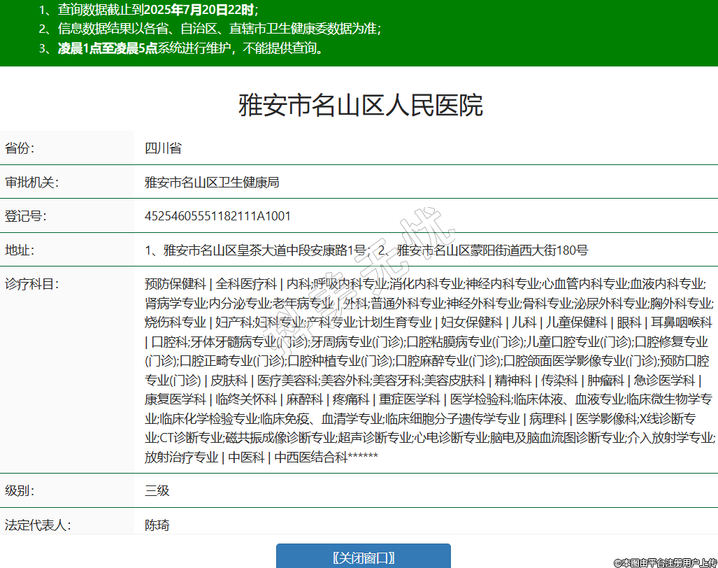 省份:四川省審批機關(guān):雅安市名山區(qū)衛(wèi)生健康局登記號:45254605551182111A1001地址:1、雅安市名山區(qū)皇茶大道中段安康路1號;2、雅安市名山區(qū)蒙陽街道西大街180號診療科目:預防保健科 | 全科醫(yī)療科 | 內(nèi)科;呼吸內(nèi)科專業(yè);消化內(nèi)科專業(yè);神經(jīng)內(nèi)科專業(yè);心血管內(nèi)科專業(yè);血液內(nèi)科專業(yè);腎病學專業(yè);內(nèi)分泌專業(yè);老年病專業(yè) | 外科;普通外科專業(yè);神經(jīng)外科專業(yè);骨科專業(yè);泌尿外科專業(yè);胸外科專業(yè);燒傷科專業(yè) | 婦產(chǎn)科;婦科專業(yè);產(chǎn)科專業(yè);計劃生育專業(yè) | 婦女保健科 | 兒科 | 兒童保健科 | 眼科 | 耳鼻咽喉科 | 口腔科;牙體牙髓病專業(yè)(門診);牙周病專業(yè)(門診);口腔粘膜病專業(yè)(門診);兒童口腔專業(yè)(門診);口腔修復專業(yè)(門診);口腔正畸專業(yè)(門診);口腔種植專業(yè)(門診);口腔麻醉專業(yè)(門診);口腔頜面醫(yī)學影像專業(yè)(門診);預防口腔專業(yè)(門診) | 皮膚科 | 醫(yī)療美容科;美容外科;美容牙科;美容皮膚科 | 精神科 | 傳染科 | 腫瘤科 | 急診醫(yī)學科 | 康復醫(yī)學科 | 臨終關(guān)懷科 | 麻醉科 | 疼痛科 | 重癥醫(yī)學科 | 醫(yī)學檢驗科;臨床體液、血液專業(yè);臨床微生物學專業(yè);臨床化學檢驗專業(yè);臨床免疫、血清學專業(yè);臨床細胞分子遺傳學專業(yè) | 病理科 | 醫(yī)學影像科;X線診斷專業(yè);CT診斷專業(yè);磁共振成像診斷專業(yè);超聲診斷專業(yè);心電診斷專業(yè);腦電及腦血流圖診斷專業(yè);介入放射學專業(yè);放射治療專業(yè) | 中醫(yī)科 | 中西醫(yī)結(jié)合科******級別:三級法定代表人:陳琦主要負責人:陳琦執(zhí)業(yè)許可證有效期:2020/08/07 -至- 2035/08/06 -