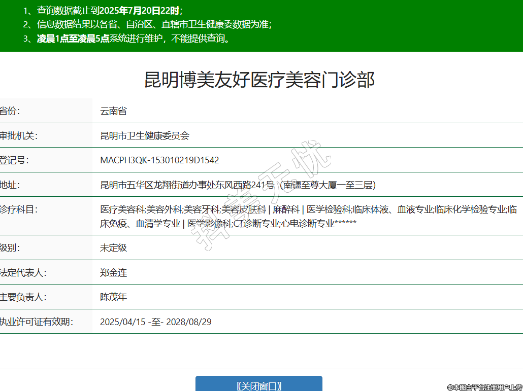 省份:云南省審批機(jī)關(guān):昆明市衛(wèi)生健康委員會登記號:MACPH3QK-153010219D1542地址:昆明市五華區(qū)龍翔街道辦事處東風(fēng)西路241號(南疆至尊大廈一至三層)診療科目:醫(yī)療美容科;美容外科;美容牙科;美容皮膚科 | 麻醉科 | 醫(yī)學(xué)檢驗(yàn)科;臨床體液、血液專業(yè);臨床化學(xué)檢驗(yàn)專業(yè);臨床免疫、血清學(xué)專業(yè) | 醫(yī)學(xué)影像科;CT診斷專業(yè);心電診斷專業(yè)******級別:未定級法定代表人:鄭金連主要負(fù)責(zé)人:陳茂年執(zhí)業(yè)許可證有效期:2025/04/15 -至- 2028/08/29 -