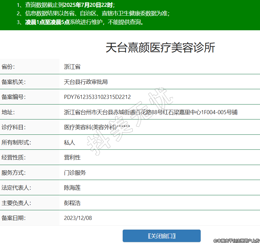 省份:浙江省備案機(jī)關(guān):天臺縣行政審批局備案編號:PDY76123533102315D2212地址:浙江省臺州市天臺縣赤城街道百花路88號紅石梁嘉里中心1F004-005號鋪診療科目:醫(yī)療美容科(美容外科)******所有制形式:私人經(jīng)營性質(zhì):營利性服務(wù)方式:門診服務(wù)法定代表人:陳海蓮主要負(fù)責(zé)人:彭程浩備案日期:2023/12/08 -