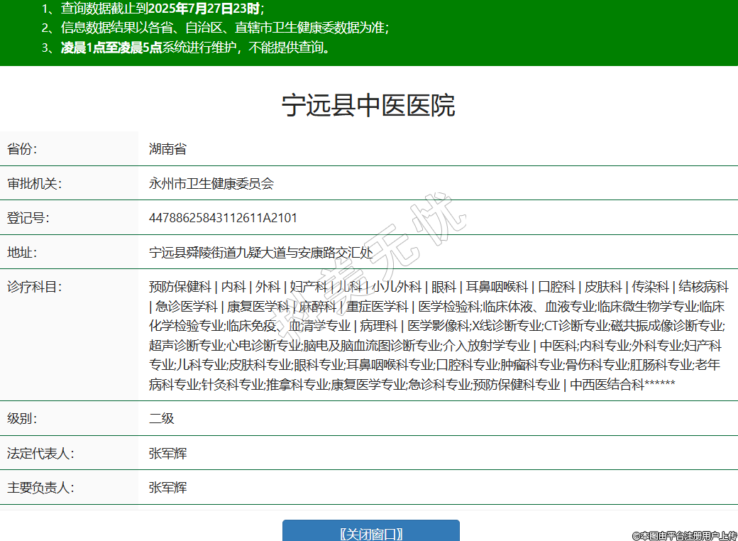 省份:湖南省審批機(jī)關(guān):永州市衛(wèi)生健康委員會(huì)登記號(hào):44788625843112611A2101地址:寧遠(yuǎn)縣舜陵街道九疑大道與安康路交匯處診療科目:預(yù)防保健科 | 內(nèi)科 | 外科 | 婦產(chǎn)科 | 兒科 | 小兒外科 | 眼科 | 耳鼻咽喉科 | 口腔科 | 皮膚科 | 傳染科 | 結(jié)核病科 | 急診醫(yī)學(xué)科 | 康復(fù)醫(yī)學(xué)科 | 麻醉科 | 重癥醫(yī)學(xué)科 | 醫(yī)學(xué)檢驗(yàn)科;臨床體液、血液專(zhuān)業(yè);臨床微生物學(xué)專(zhuān)業(yè);臨床化學(xué)檢驗(yàn)專(zhuān)業(yè);臨床免疫、血清學(xué)專(zhuān)業(yè) | 病理科 | 醫(yī)學(xué)影像科;X線診斷專(zhuān)業(yè);CT診斷專(zhuān)業(yè);磁共振成像診斷專(zhuān)業(yè);超聲診斷專(zhuān)業(yè);心電診斷專(zhuān)業(yè);腦電及腦血流圖診斷專(zhuān)業(yè);介入放射學(xué)專(zhuān)業(yè) | 中醫(yī)科;內(nèi)科專(zhuān)業(yè);外科專(zhuān)業(yè);婦產(chǎn)科專(zhuān)業(yè);兒科專(zhuān)業(yè);皮膚科專(zhuān)業(yè);眼科專(zhuān)業(yè);耳鼻咽喉科專(zhuān)業(yè);口腔科專(zhuān)業(yè);腫瘤科專(zhuān)業(yè);骨傷科專(zhuān)業(yè);肛腸科專(zhuān)業(yè);老年病科專(zhuān)業(yè);針灸科專(zhuān)業(yè);推拿科專(zhuān)業(yè);康復(fù)醫(yī)學(xué)專(zhuān)業(yè);急診科專(zhuān)業(yè);預(yù)防保健科專(zhuān)業(yè) | 中西醫(yī)結(jié)合科******級(jí)別:二級(jí)法定代表人:張軍輝主要負(fù)責(zé)人:張軍輝執(zhí)業(yè)許可證有效期:2019/07/15 -至- 2034/07/14 -
