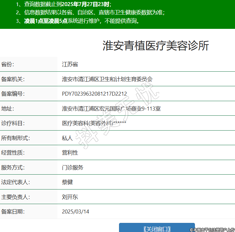 省份:江蘇省備案機(jī)關(guān):淮安市清江浦區(qū)衛(wèi)生和計(jì)劃生育委員會(huì)備案編號(hào):PDY70239632081217D2212地址:淮安市清江浦區(qū)宏元國(guó)際廣場(chǎng)商業(yè)9-113室診療科目:醫(yī)療美容科(美容外科)******所有制形式:私人經(jīng)營(yíng)性質(zhì):營(yíng)利性服務(wù)方式:門診服務(wù)法定代表人:蔡健主要負(fù)責(zé)人:劉開(kāi)東備案日期:2025/03/14 -