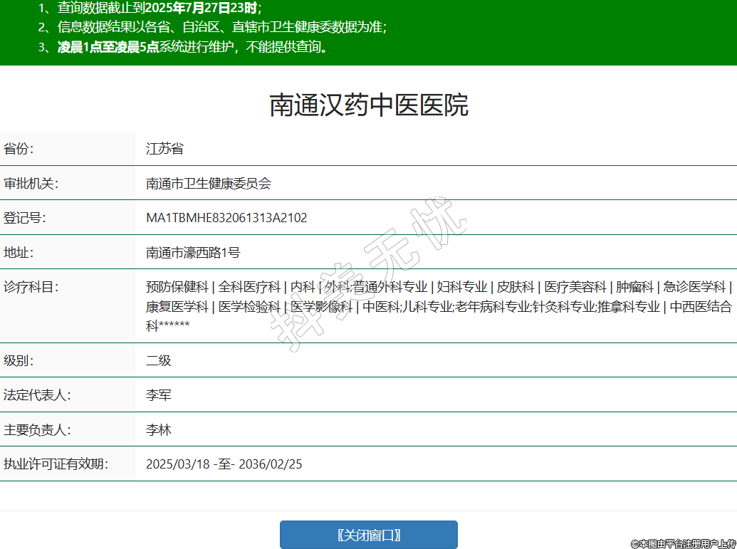 省份:江蘇省審批機(jī)關(guān):南通市衛(wèi)生健康委員會(huì)登記號(hào):MA1TBMHE832061313A2102地址:南通市濠西路1號(hào)診療科目:預(yù)防保健科 | 全科醫(yī)療科 | 內(nèi)科 | 外科;普通外科專業(yè) | 婦科專業(yè) | 皮膚科 | 醫(yī)療美容科 | 腫瘤科 | 急診醫(yī)學(xué)科 | 康復(fù)醫(yī)學(xué)科 | 醫(yī)學(xué)檢驗(yàn)科 | 醫(yī)學(xué)影像科 | 中醫(yī)科;兒科專業(yè);老年病科專業(yè);針灸科專業(yè);推拿科專業(yè) | 中西醫(yī)結(jié)合科******級(jí)別:二級(jí)法定代表人:李軍主要負(fù)責(zé)人:李林執(zhí)業(yè)許可證有效期:2025/03/18 -至- 2036/02/25 -