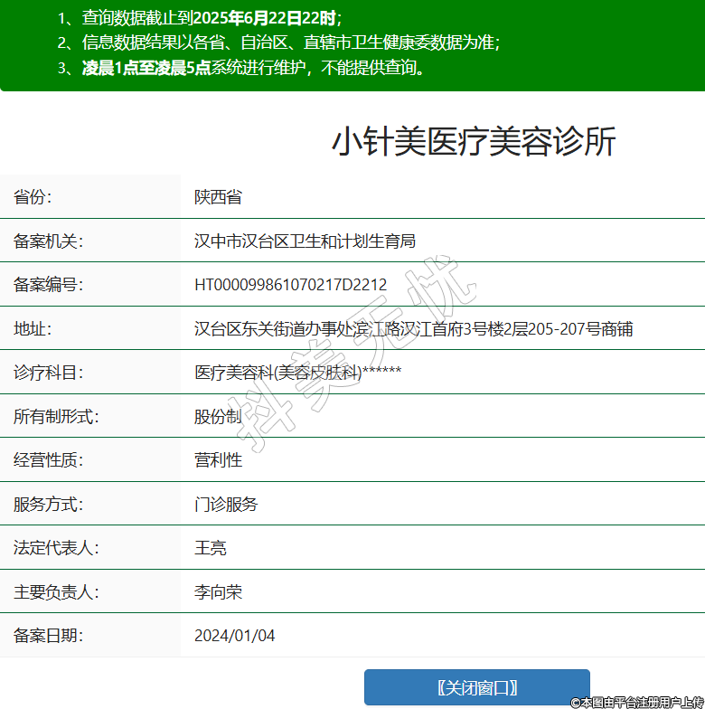 省份:陜西省備案機(jī)關(guān):漢中市漢臺區(qū)衛(wèi)生和計(jì)劃生育局備案編號:HT000099861070217D2212地址:漢臺區(qū)東關(guān)街道辦事處濱江路漢江首府3號樓2層205-207號商鋪診療科目:醫(yī)療美容科(美容皮膚科)******所有制形式:股份制經(jīng)營性質(zhì):營利性服務(wù)方式:門診服務(wù)法定代表人:王亮主要負(fù)責(zé)人:李向榮備案日期:2024/01/04 -