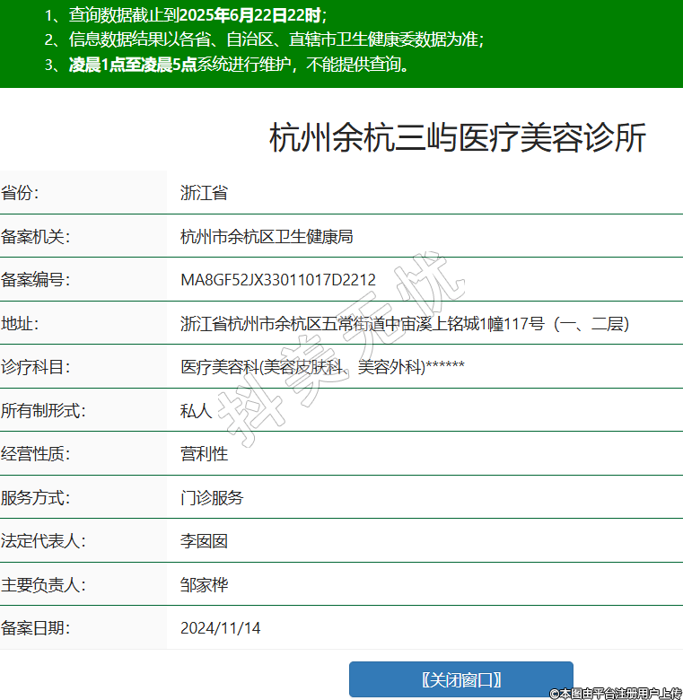 省份:浙江省備案機(jī)關(guān):杭州市余杭區(qū)衛(wèi)生健康局備案編號(hào):MA8GF52JX33011017D2212地址:浙江省杭州市余杭區(qū)五常街道中宙溪上銘城1幢117號(hào)(一、二層)診療科目:醫(yī)療美容科(美容皮膚科、美容外科)******所有制形式:私人經(jīng)營(yíng)性質(zhì):營(yíng)利性服務(wù)方式:門診服務(wù)法定代表人:李囡囡主要負(fù)責(zé)人:鄒家樺備案日期:2024/11/14 -
