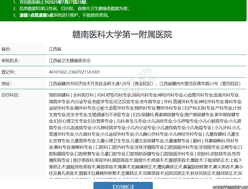 省份:江西省審批機(jī)關(guān):江西省衛(wèi)生健康委員會登記號:46101602-236070211A1001地址:江西省贛州市經(jīng)濟(jì)技術(shù)開發(fā)區(qū)金嶺大道128號(黃金院區(qū));江西省贛州市章貢區(qū)青年路23號(章貢院區(qū))診療科目:預(yù)防保健科 | 全科醫(yī)療科 | 內(nèi)科;呼吸內(nèi)科專業(yè);消化內(nèi)科專業(yè);神經(jīng)內(nèi)科專業(yè);心血管內(nèi)科專業(yè);血液內(nèi)科專業(yè);腎病學(xué)專業(yè);內(nèi)分泌專業(yè);免疫學(xué)專業(yè);變態(tài)反應(yīng)專業(yè);老年病專業(yè) | 外科;普通外科專業(yè);神經(jīng)外科專業(yè);骨科專業(yè);泌尿外科專業(yè);胸外科專業(yè);心臟大血管外科專業(yè);燒傷科專業(yè);整形外科專業(yè) | 婦產(chǎn)科;婦科專業(yè);產(chǎn)科專業(yè);計劃生育專業(yè);優(yōu)生學(xué)專業(yè);生殖健康與不孕癥專業(yè) | 婦女保健科;青春期保健專業(yè);圍產(chǎn)期保健專業(yè);更年期保健專業(yè);婦女心理衛(wèi)生專業(yè);婦女營養(yǎng)專業(yè) | 兒科;新生兒專業(yè);小兒消化專業(yè);小兒呼吸專業(yè);小兒心臟病專業(yè);小兒腎病專業(yè);小兒血液病專業(yè);小兒神經(jīng)病學(xué)專業(yè);小兒內(nèi)分泌專業(yè);小兒遺傳病專業(yè);小兒免疫專業(yè) | 小兒外科;小兒普通外科專業(yè);小兒骨科專業(yè);小兒泌尿外科專業(yè);小兒胸心外科專業(yè);小兒神經(jīng)外科專業(yè) | 兒童保健科;兒童生長發(fā)育專業(yè);兒童營養(yǎng)專業(yè);兒童心理衛(wèi)生專業(yè);兒童五官保健專業(yè);兒童康復(fù)專業(yè) | 眼科 | 耳鼻咽喉科;耳科專業(yè);鼻科專業(yè);咽喉科專業(yè) | 口腔科;口腔內(nèi)科專業(yè);牙體牙髓病專業(yè);口腔頜面外科專業(yè);牙周病專業(yè);正畸專業(yè);口腔粘膜病專業(yè);口腔修復(fù)專業(yè);兒童口腔專業(yè);口腔預(yù)防保健專業(yè);口腔頜面外科專業(yè) | 皮膚科;皮膚病專業(yè);性傳播疾病專業(yè) | 醫(yī)療美容科;美容外科;眉部美容術(shù);眉提升術(shù);修眉手術(shù);眼部美容術(shù);重瞼術(shù);下瞼袋矯正術(shù);上瞼下垂矯正術(shù);眼瞼其他美容術(shù);鼻部美容術(shù);隆鼻術(shù);駝峰鼻矯正術(shù);鷹鉤鼻矯正術(shù);鼻翼缺損修復(fù)術(shù);鼻尖美容術(shù);鼻小柱及鼻孔美容術(shù);唇裂術(shù)后鼻畸形修復(fù)術(shù);歪鼻矯正術(shù);耳廓美容術(shù);招風(fēng)耳矯正術(shù);杯狀耳矯正術(shù);隱耳矯正術(shù);耳垂畸形修復(fù)術(shù);耳廓再造術(shù);口唇部美容術(shù);唇裂修復(fù)術(shù);唇裂術(shù)后畸形修復(fù)術(shù);重唇美容術(shù);唇峰、薄唇增厚美容術(shù);唇珠美容術(shù);口角成形術(shù);酒窩成形術(shù);唇系帶延長成形術(shù);頜面部美容術(shù);顳部填充術(shù);顴部美容術(shù);頦成形術(shù);面部除皺術(shù);額部除皺術(shù);顳部除皺術(shù);面頸部除皺術(shù);中面部除皺術(shù);額顳部除皺術(shù);額顳面部除皺術(shù);顳面頸部除皺術(shù);全面頸部除皺術(shù);內(nèi)窺鏡除皺術(shù);面部懸吊除皺術(shù);乳房美容術(shù);隆乳術(shù);乳房肥大縮小術(shù);乳頭內(nèi)陷矯正術(shù);乳頭肥大縮小術(shù);乳房下垂矯正術(shù);乳頭乳暈重建術(shù);脂肪抽吸及腹壁成形術(shù);負(fù)壓脂肪抽吸術(shù);超聲脂肪抽吸術(shù);電子吸脂術(shù);注射器法吸脂術(shù);腹壁成形術(shù);會陰部美容術(shù);處女膜修復(fù)術(shù);陰道松弛縮緊術(shù);陰蒂肥大縮小術(shù);小陰唇肥大縮小術(shù);包皮環(huán)切術(shù);陰莖延長術(shù);美容牙科;牙齒美容修復(fù)技術(shù);潔齒術(shù);牙齒修形術(shù);牙齒漂白術(shù);復(fù)合樹脂黏結(jié)修復(fù)技術(shù);瓷貼面修復(fù)技術(shù);樁冠修復(fù)技術(shù);金屬烤瓷冠橋修復(fù)技術(shù);全瓷冠技術(shù);自凝丙稀酸樹脂臨時冠技術(shù);可摘局部義齒美容修復(fù)技術(shù);全口義齒美容修復(fù)技術(shù);即刻義齒美容修復(fù)技術(shù);植牙美容修復(fù)技術(shù);黏結(jié)鑄造固定橋美容修復(fù)技術(shù);柔性義齦美容修復(fù)技術(shù);隱形義齒美容修復(fù)技術(shù);套筒冠義齒美容修復(fù)技術(shù);牙周美容技術(shù)操作;牙齦切除術(shù);牙齦成形術(shù);牙冠延長術(shù);牙周骨手術(shù);根尖向復(fù)位瓣術(shù);側(cè)向轉(zhuǎn)位瓣術(shù);雙乳頭瓣移位術(shù);冠向復(fù)位瓣術(shù);自體游離齦瓣移植術(shù);牙周引導(dǎo)組織再生術(shù);牙槽骨修整術(shù);牙槽骨嵴修整術(shù);牙槽嵴增高術(shù);牙頜畸形美容矯治技術(shù);機(jī)械性活動性矯治器矯治技術(shù);功能性矯治器矯治技術(shù);固定矯治技術(shù);美容皮膚科;美容皮膚術(shù)(外科);診斷技術(shù);真菌鏡檢技術(shù);斑貼試驗技術(shù);皮膚活檢術(shù);治療技術(shù);糖皮質(zhì)激素皮損內(nèi)注射;藥物加壓治療;外用藥物治療;光化學(xué)療法;美容皮膚術(shù)(內(nèi)科);皮膚磨削術(shù);酒渣鼻切割術(shù);皮膚腫物切除術(shù);拔甲術(shù);刮除術(shù);自體表皮移植術(shù);腋臭手術(shù);足病修治術(shù);醫(yī)療美容心理診斷及輔導(dǎo);美容醫(yī)療應(yīng)用技術(shù);物理美容治療術(shù);激光美容治療術(shù);高頻電美容治療;冷凍美容治療;其他物理美容治療;脫毛術(shù);穿耳孔術(shù);注射美容
